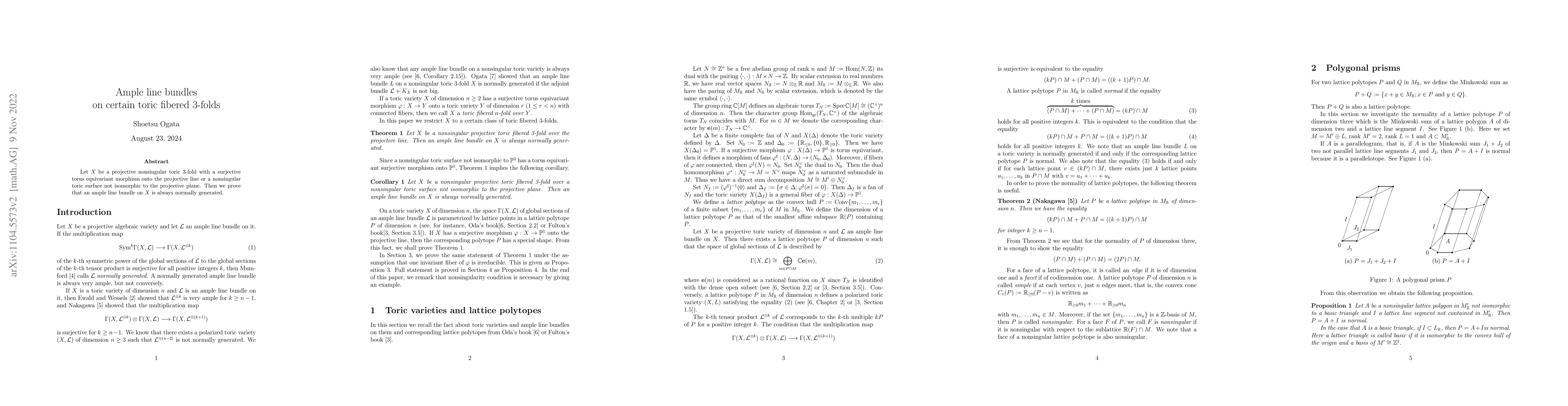 Summary: This paper proves that for a projective, nonsingular toric 3-fold $X$ with a specific torus equivariant morphism to the projective line, any ample line bundle on $X$ is normally generated. This establishes a property of ampleness for line bundles in this toric geometric context.