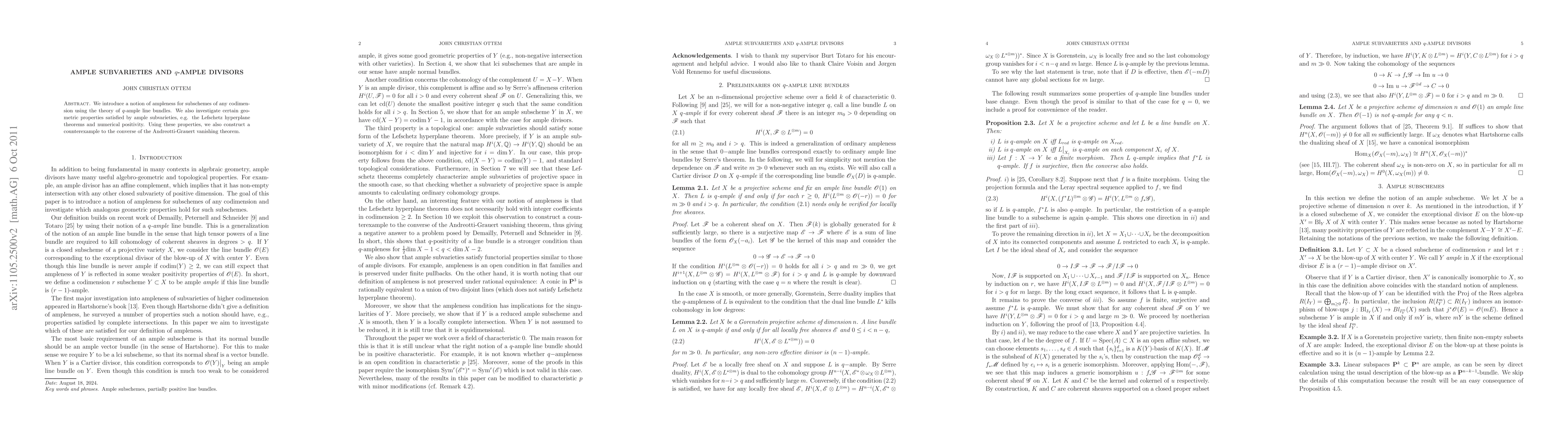 This paper introduces a new concept of ampleness for subvarieties of higher codimension via q-ample line bundles and explores related geometric properties, including the Lefschetz hyperplane theorems and numerical positivity. It also provides a counterexample to the converse of the Andreotti-Grauert vanishing theorem.