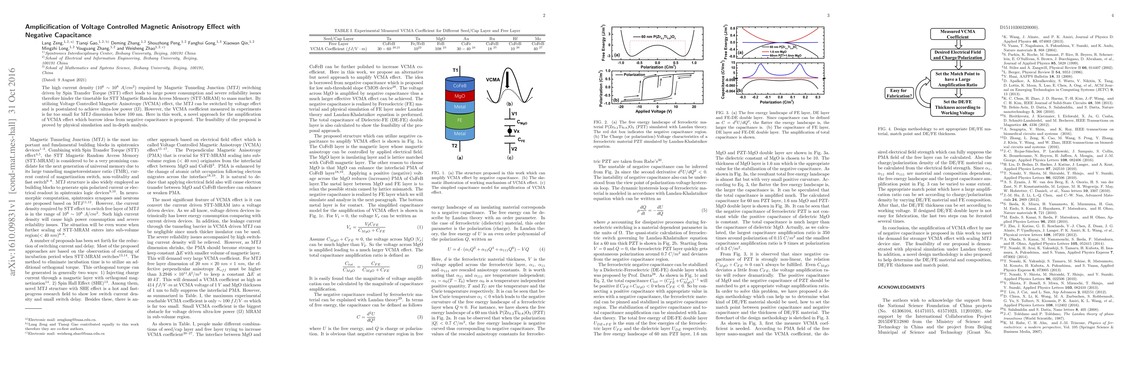 The high current density required by Magnetic Tunneling Junction (MTJ) switching driven by Spin Transfer Torque (STT) effect leads to large power consumption and severe reliability issues therefore hinder the timetable for STT Magnetic Random Access Memory (STT-MRAM) to mass market. By utilizing Voltage Controlled Magnetic Anisotropy (VCMA) effect, the MTJ can be switched by voltage effect and is postulated to achieve ultra-low power (fJ). However, the VCMA coefficient measured in experiments is far too small for MTJ dimension below 100 nm. Here in this work, a novel approach for the amplification of VCMA effect which borrow ideas from negative capacitance is proposed. The feasibility of the proposal is proved by physical simulation and in-depth analysis.