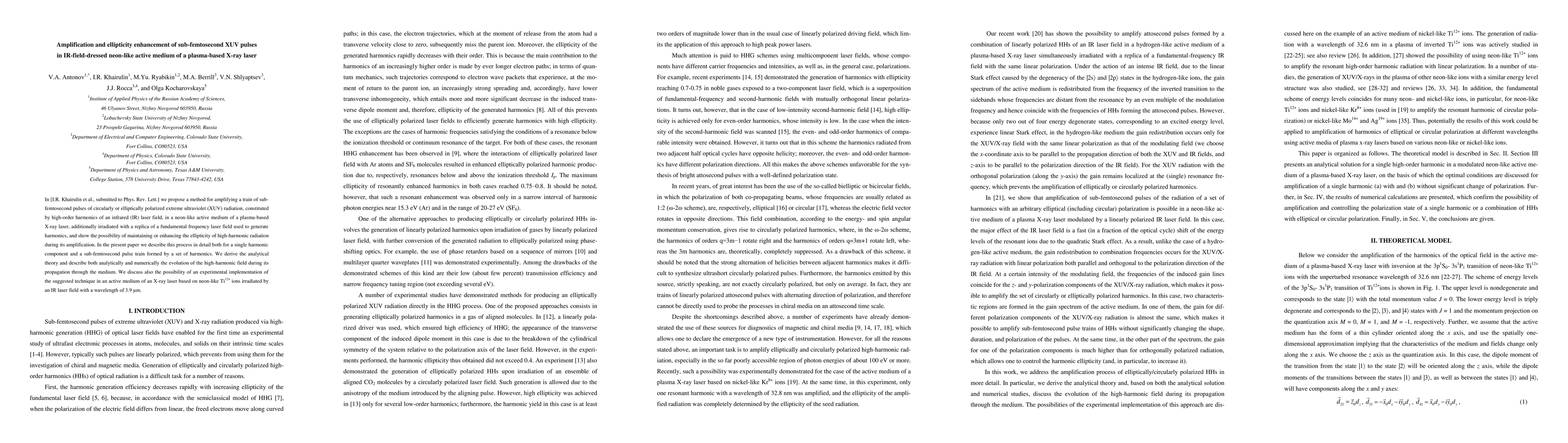 In [I.R. Khairulin et al., submitted to Phys. Rev. Lett.] we propose a method for amplifying a train of sub-femtosecond pulses of circularly or elliptically polarized extreme ultraviolet (XUV) radiation, constituted by high-order harmonics of an infrared (IR) laser field, in a neon-like active medium of a plasma-based X-ray laser, additionally irradiated with a replica of a fundamental frequency laser field used to generate harmonics, and show the possibility of maintaining or enhancing the ellipticity of high-harmonic radiation during its amplification. In the present paper we describe this process in detail both for a single harmonic component and a sub-femtosecond pulse train formed by a set of harmonics. We derive the analytical theory and describe both analytically and numerically the evolution of the high-harmonic field during its propagation through the medium. We discuss also the possibility of an experimental implementation of the suggested technique in an active medium of an X-ray laser based on neon-like Ti^{12+} ions irradiated by an IR laser field with a wavelength of 3.9 microns.