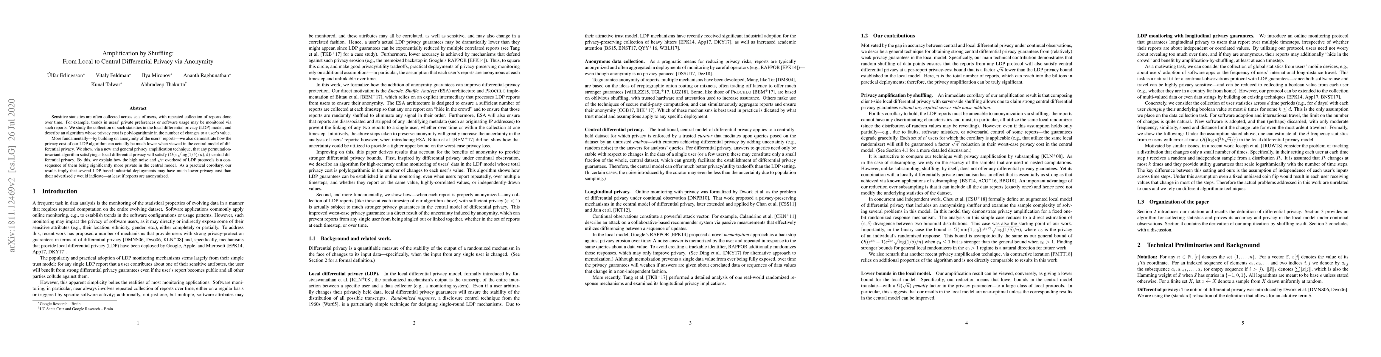 Sensitive statistics are often collected across sets of users, with repeated collection of reports done over time. For example, trends in users' private preferences or software usage may be monitored via such reports. We study the collection of such statistics in the local differential privacy (LDP) model, and describe an algorithm whose privacy cost is polylogarithmic in the number of changes to a user's value. More fundamentally---by building on anonymity of the users' reports---we also demonstrate how the privacy cost of our LDP algorithm can actually be much lower when viewed in the central model of differential privacy. We show, via a new and general privacy amplification technique, that any permutation-invariant algorithm satisfying $\varepsilon$-local differential privacy will satisfy $(O(\varepsilon \sqrt{\log(1/\delta)/n}), \delta)$-central differential privacy. By this, we explain how the high noise and $\sqrt{n}$ overhead of LDP protocols is a consequence of them being significantly more private in the central model. As a practical corollary, our results imply that several LDP-based industrial deployments may have much lower privacy cost than their advertised $\varepsilon$ would indicate---at least if reports are anonymized.