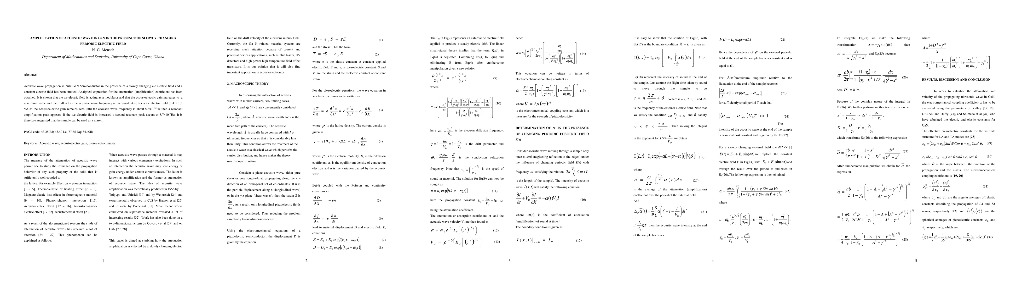 Summary: This study investigates acoustic wave behavior in GaN semiconductor under a combination of slowly changing a.c electric fields and a constant field, revealing an acoustoelectric gain modulated by the a.c field that peaks and then declines with frequency. At specific frequencies, resonant amplification peaks occur, suggesting potential for the material to function as a maser.