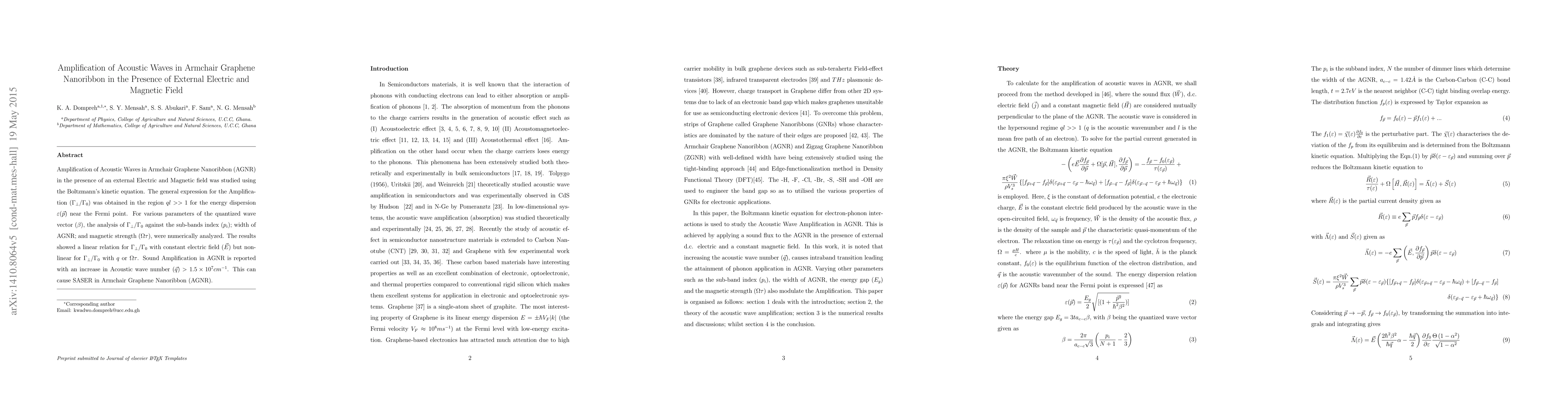 This study investigates the amplification of acoustic waves in armchair graphene nanoribbons under external electric and magnetic fields using Boltzmann's kinetic equation. Results show linear amplification with a constant electric field and non-linear amplification with wave number or magnetic strength, suggesting potential for SASER in AGNR.