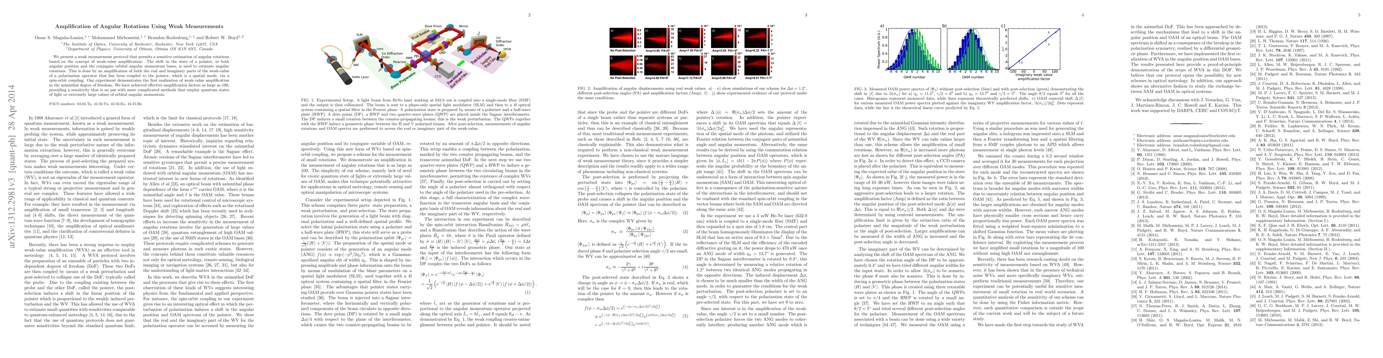 This paper introduces a weak measurement protocol for amplifying angular rotations using weak-value amplification, achieving effective amplification factors of up to 100. The method estimates angular rotations by observing the shift in the state of a pointer in angular position and orbital angular momentum bases.