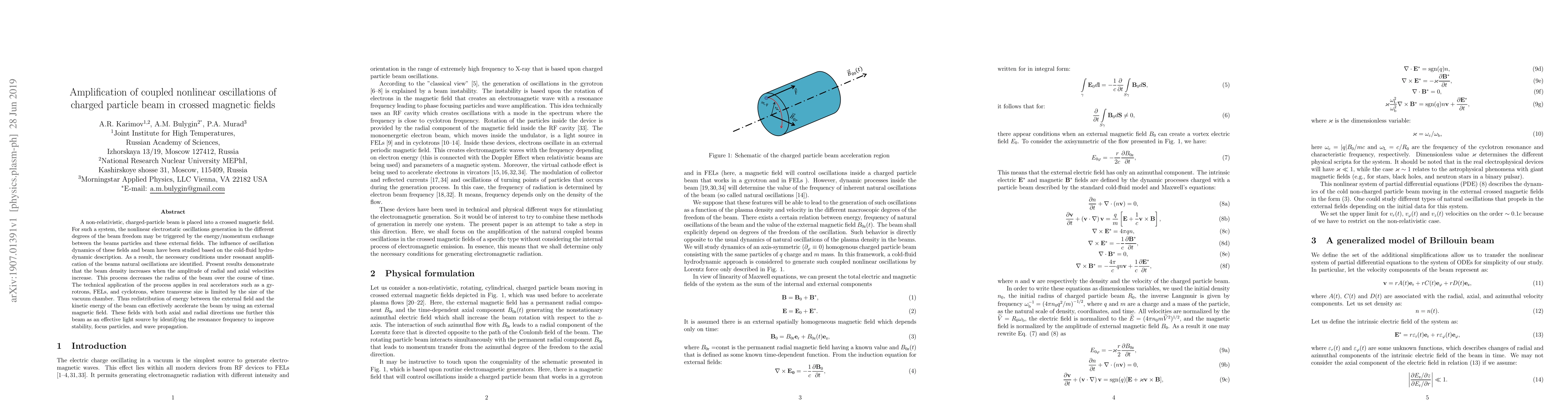A non-relativistic, charged-particle beam is placed into a crossed magnetic field. For such a system, the nonlinear electrostatic oscillations generation in the different degrees of the beam freedom may be triggered by the energy/momentum exchange between the beam's particles and these external fields. The influence of oscillation dynamics of these fields and beam have been studied based on the cold-fluid hydrodynamic description. As a result, the necessary conditions under resonant amplification of the beam's natural oscillations are identified. Present results demonstrate that the beam density increases when the amplitude of radial and axial velocities increase. This process decreases the radius of the beam over the course of time. The technical application of the process applies in real accelerators such as a gyrotrons, FELs, and cyclotrons, where transverse size is limited by the size of the vacuum chamber. Thus redistribution of energy between the external field and the kinetic energy of the beam can effectively accelerate the beam by using an external magnetic field. These fields with both axial and radial directions use further this beam as an effective light source by identifying the resonance frequency to improve stability, focus particles, and wave propagation.