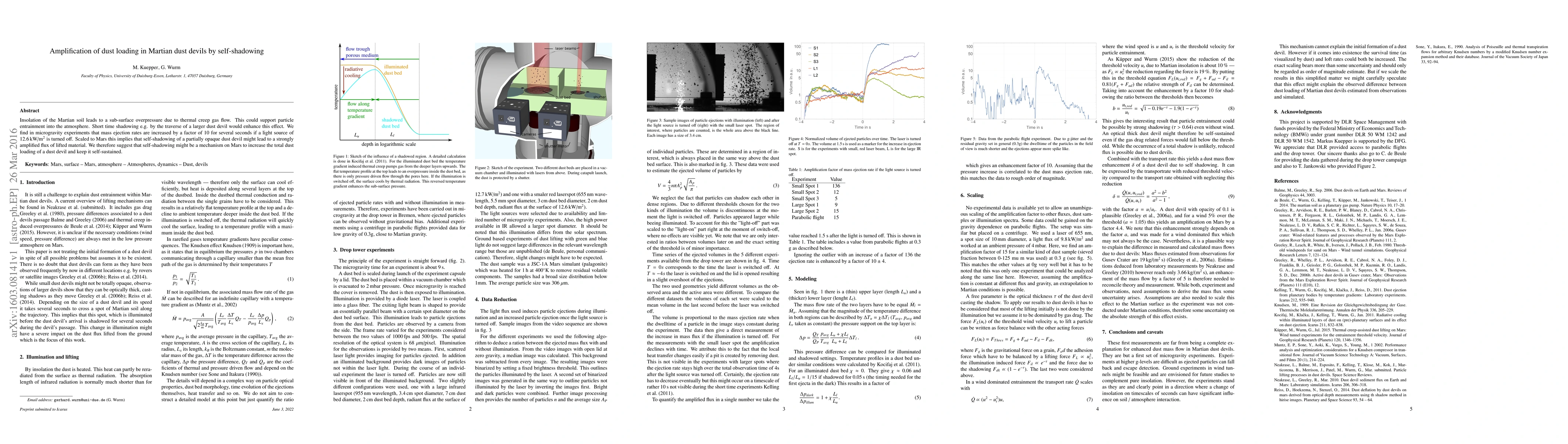 Insolation of the Martian soil leads to a sub-surface overpressure due to thermal creep gas flow. This could support particle entrainment into the atmosphere. Short time shadowing e.g. by the traverse of a larger dust devil would enhance this effect. We find in microgravity experiments that mass ejection rates are increased by a factor of 10 for several seconds if a light source of 12.6 kW/$\rm m^2$ is turned off. Scaled to Mars this implies that self-shadowing of a partially opaque dust devil might lead to a strongly amplified flux of lifted material. We therefore suggest that self-shadowing might be a mechanism on Mars to increase the total dust loading of a dust devil and keep it self-sustained.