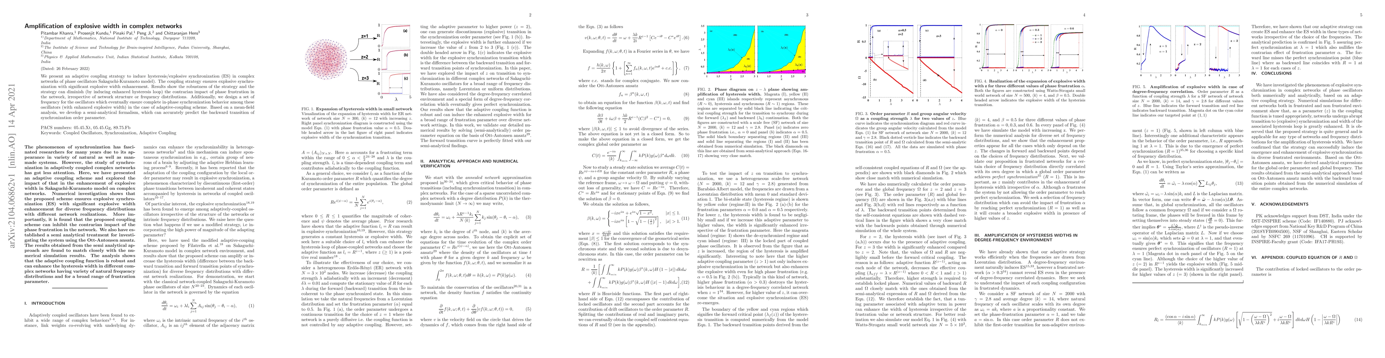 The research employs an adaptive coupling strategy to induce hysteresis/explosive synchronization (ES) in complex networks of phase oscillators using the Sakaguchi-Kuramoto model. A mean-field analysis and Ott-Antonsen ansatz are utilized for semi-analytical predictions.