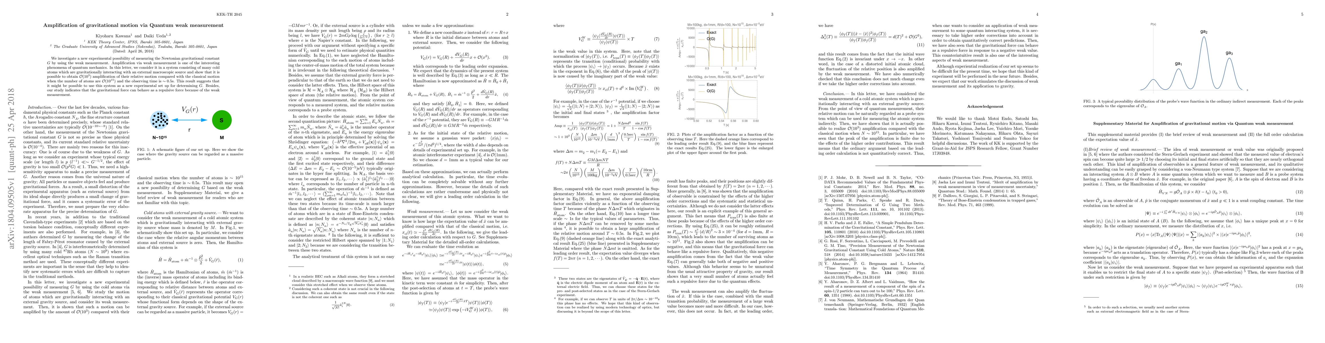 This paper explores the potential of using quantum weak measurement to amplify gravitational motion, achieving an ${\mathcal{O}}(10^{3})$ amplification in relative motion of cold atoms interacting with a macroscopic source. The study suggests this method could serve as a novel experimental setup for measuring the Newtonian gravitational constant $G$.