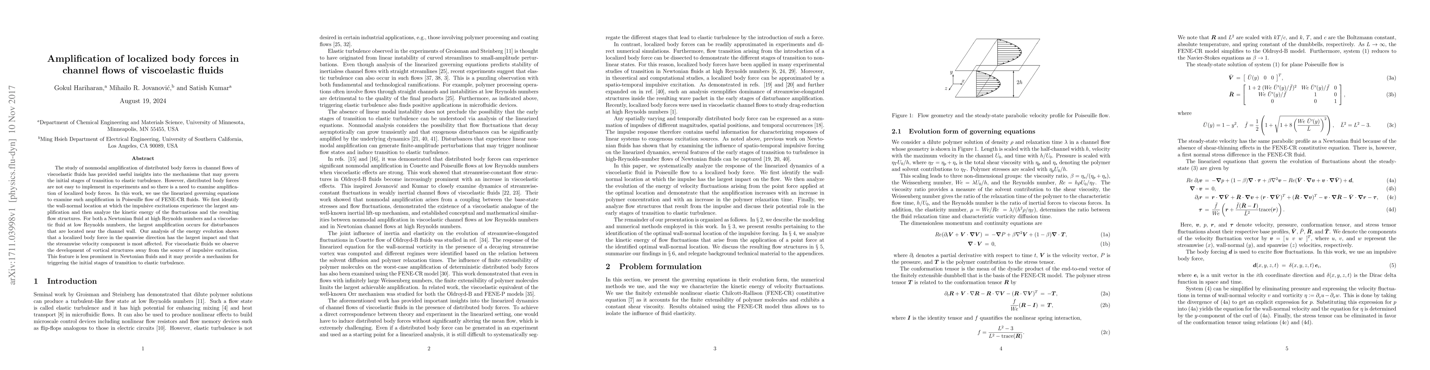 This paper investigates the amplification of localized body forces in channel flows of viscoelastic fluids using linearized governing equations. It finds that the largest amplification occurs near the channel wall, with spanwise localized forces having the most significant impact on streamwise velocity components, and reveals the development of vortical structures in viscoelastic fluids that may initiate transition to elastic turbulence.