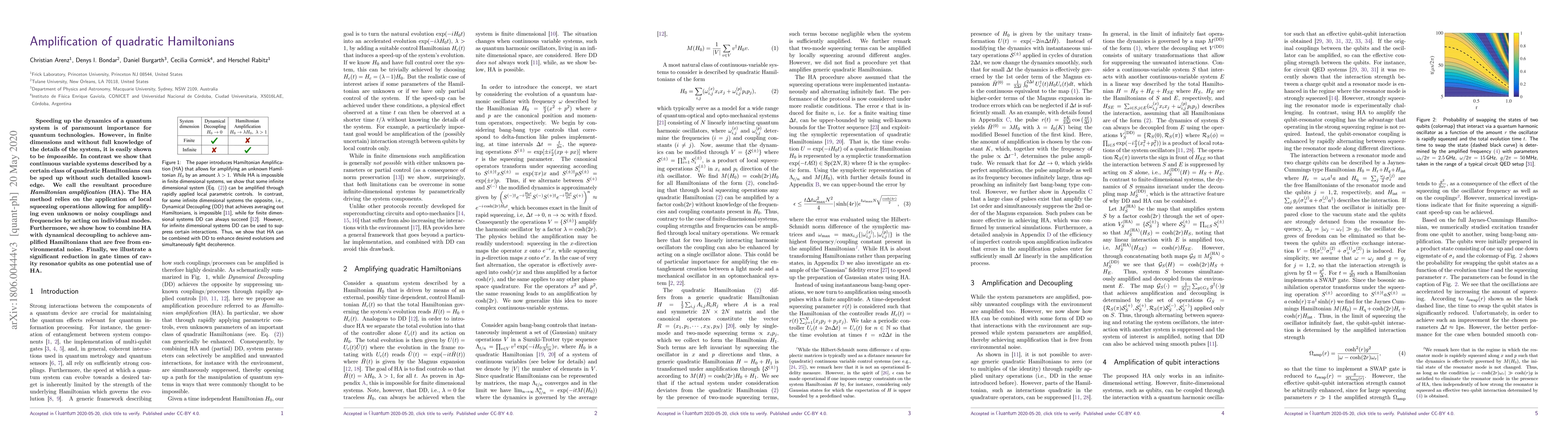 Speeding up the dynamics of a quantum system is of paramount importance for quantum technologies. However, in finite dimensions and without full knowledge of the details of the system, it is easily shown to be impossible. In contrast we show that continuous variable systems described by a certain class of quadratic Hamiltonians can be sped up without such detailed knowledge. We call the resultant procedure Hamiltonian amplification (HA). The HA method relies on the application of local squeezing operations allowing for amplifying even unknown or noisy couplings and frequencies by acting on individual modes. Furthermore, we show how to combine HA with dynamical decoupling to achieve amplified Hamiltonians that are free from environmental noise. Finally, we illustrate a significant reduction in gate times of cavity resonator qubits as one potential use of HA.