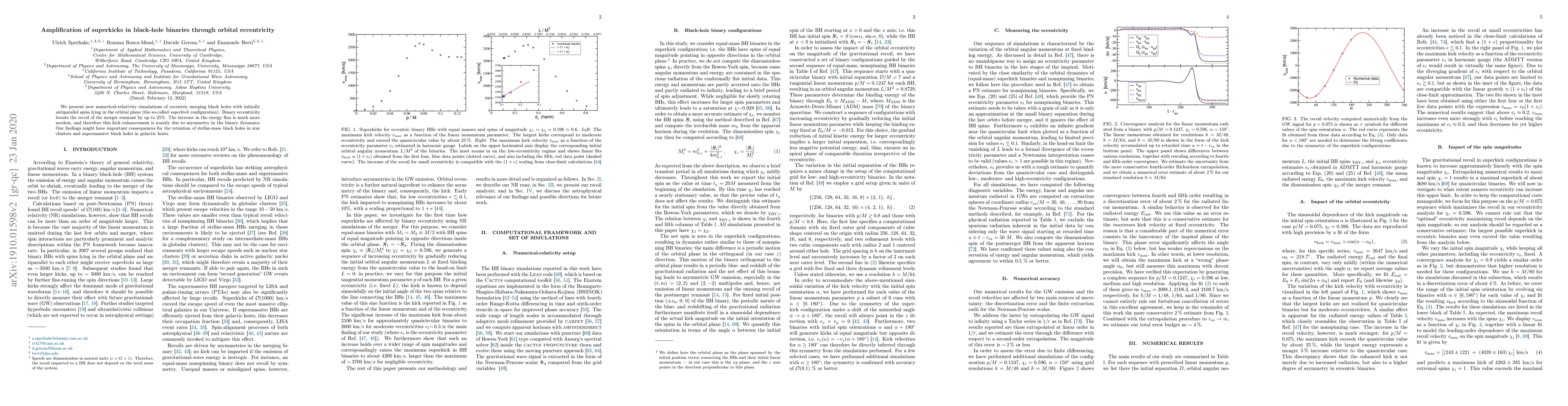 We present new numerical-relativity simulations of eccentric merging black holes with initially antiparallel spins lying in the orbital plane (the so-called \emph{superkick} configuration). Binary eccentricity boosts the recoil of the merger remnant by up to $25\%$. The increase in the energy flux is much more modest, and therefore this kick enhancement is mainly due to asymmetry in the binary dynamics. Our findings might have important consequences for the retention of stellar-mass black holes in star clusters and supermassive black holes in galactic hosts.