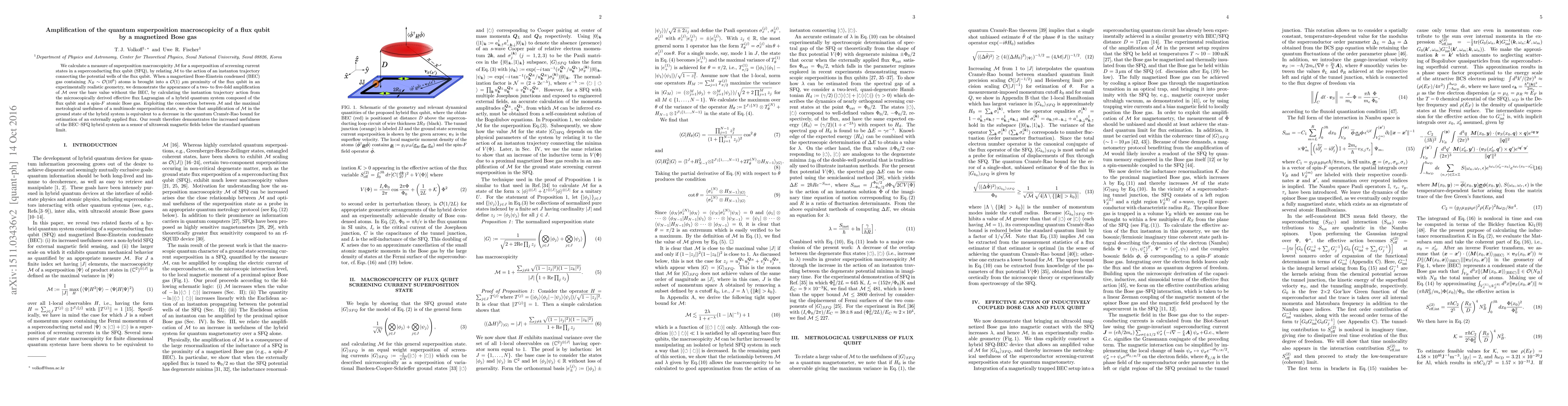 Researchers demonstrate a 2- to 5-fold amplification of a quantum superposition macroscopicity in a superconducting flux qubit by surrounding it with a magnetized Bose gas, increasing its sensitivity to weak magnetic fields.