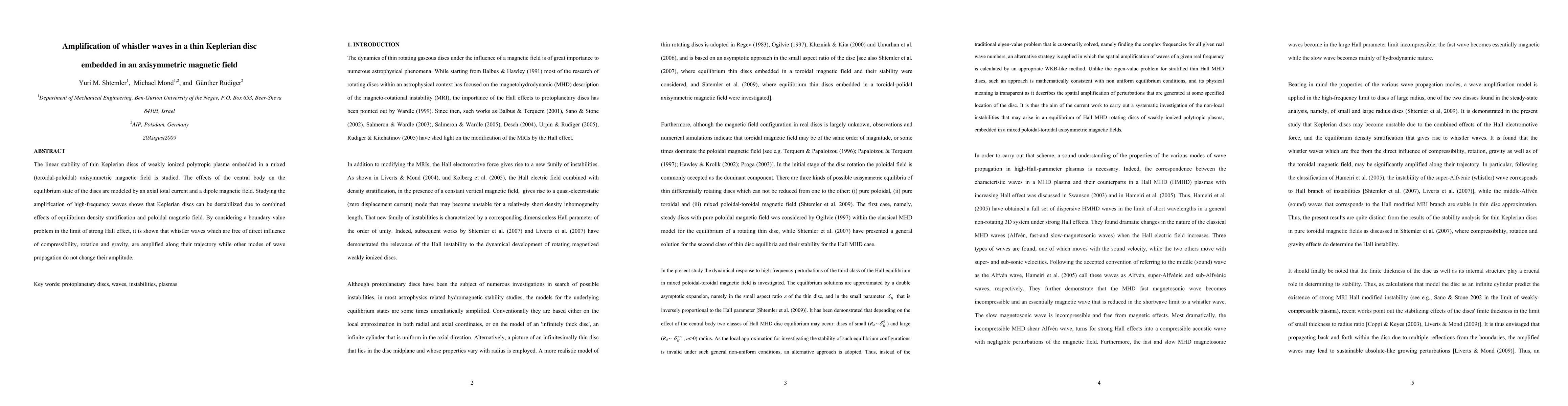 The linear stability of thin Keplerian discs of weakly ionized polytropic plasma embedded in a mixed (toroidal-poloidal) axisymmetric magnetic field is studied. The effects of the central body on the equilibrium state of the discs are modeled by an axial total current and a dipole magnetic field. Studying the amplification of high-frequency waves shows that Keplerian discs can be destabilized due to combined effects of equilibrium density stratification and poloidal magnetic field. By considering a boundary value problem in the limit of strong Hall effect, it is shown that whistler waves which are free of direct influence of compressibility, rotation and gravity, are amplified along their trajectory while other modes of wave propagation do not change their amplitude.
