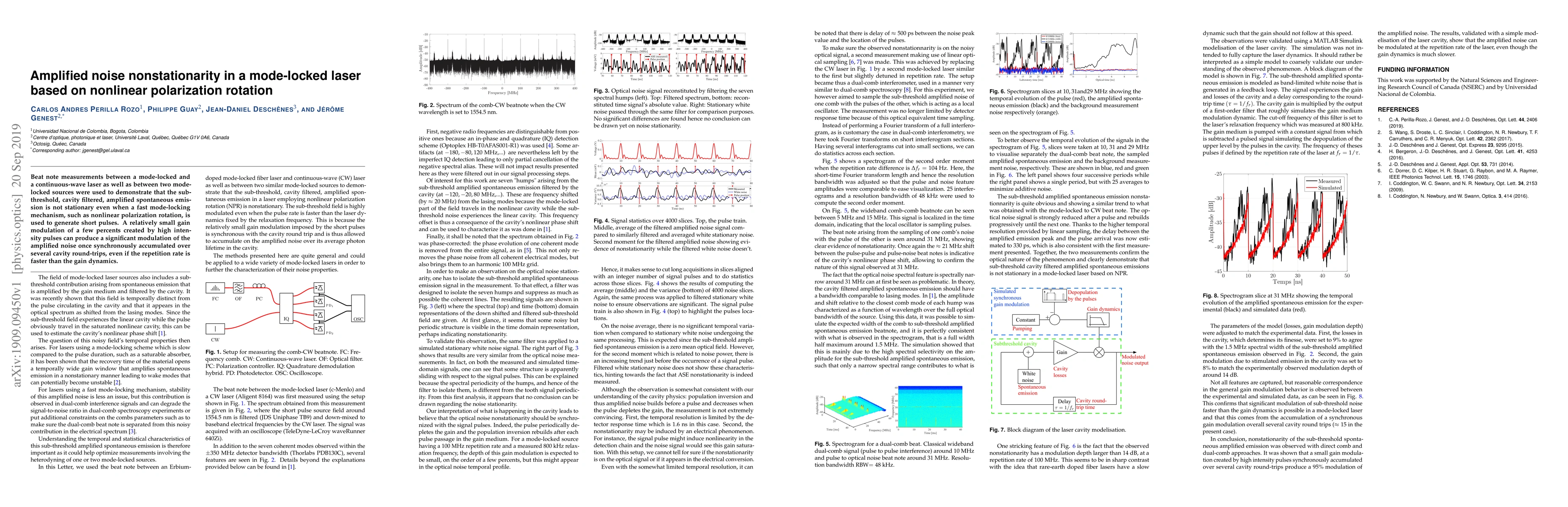 Beat note measurements between a mode-locked and a continuous-wave laser as well as between two mode-locked sources were used to demonstrate that the sub-threshold, cavity filtered, amplified spontaneous emission is not stationary even when a fast mode-locking mechanism, such as nonlinear polarization rotation, is used to generate short pulses. A relatively small gain modulation of a few percents created by high intensity pulses can produce a significant modulation of the amplified noise once synchronously accumulated over several cavity round-trips, even if the repetition rate is faster than the gain dynamics.