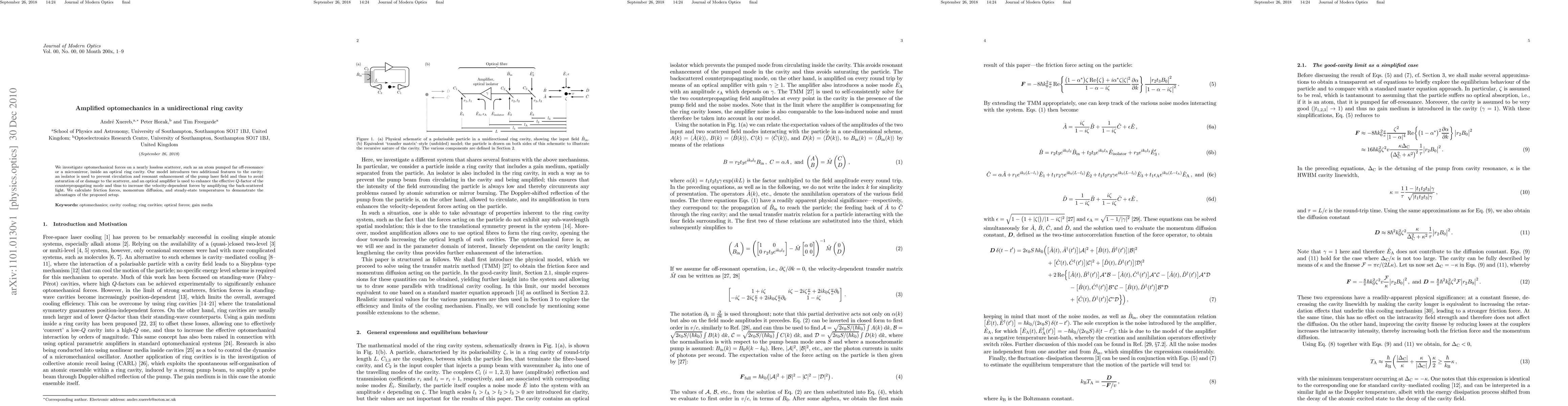 We investigate optomechanical forces on a nearly lossless scatterer, such as an atom pumped far off-resonance or amicromirror, inside an optical ring cavity. Our model introduces two additional features to the cavity: an isolator is used to prevent circulation and resonant enhancement of the pump laser field and thus to avoid saturation of or damage to the scatterer, and an optical amplifier is used to enhance the effective $Q$-factor of the counterpropagating mode and thus to increase the velocity-dependent forces by amplifying the back-scattered light. We calculate friction forces, momentum diffusion, and steady-state temperatures to demonstrate the advantages of the proposed setup.
