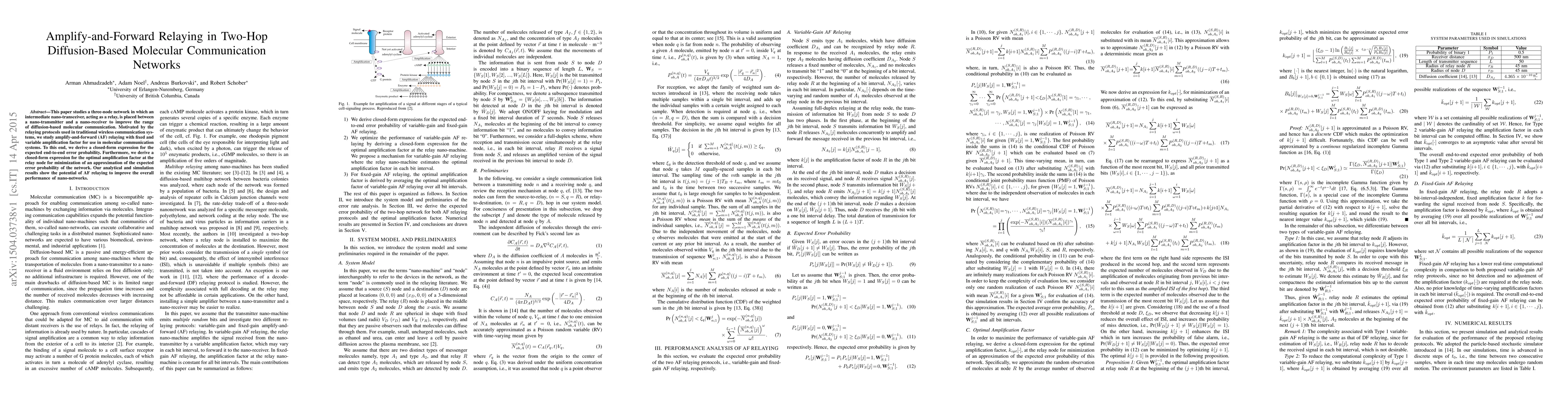 This paper investigates amplify-and-forward relaying in two-hop diffusion-based molecular communication networks, deriving expressions for end-to-end error probability and optimal amplification factor. Results suggest AF relaying can enhance the performance of nano-networks.