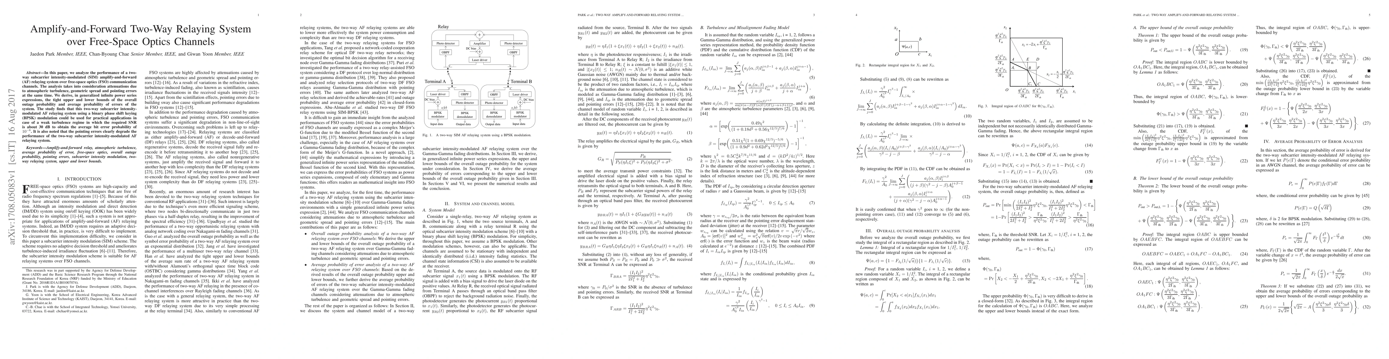 This paper analyzes the performance of a two-way amplify-and-forward relaying system over free-space optics channels, considering atmospheric turbulence and pointing errors. The study derives bounds for outage and error probabilities, finding that the system is practical for weak turbulence with a required SNR of 30 dB, but pointing errors degrade performance.