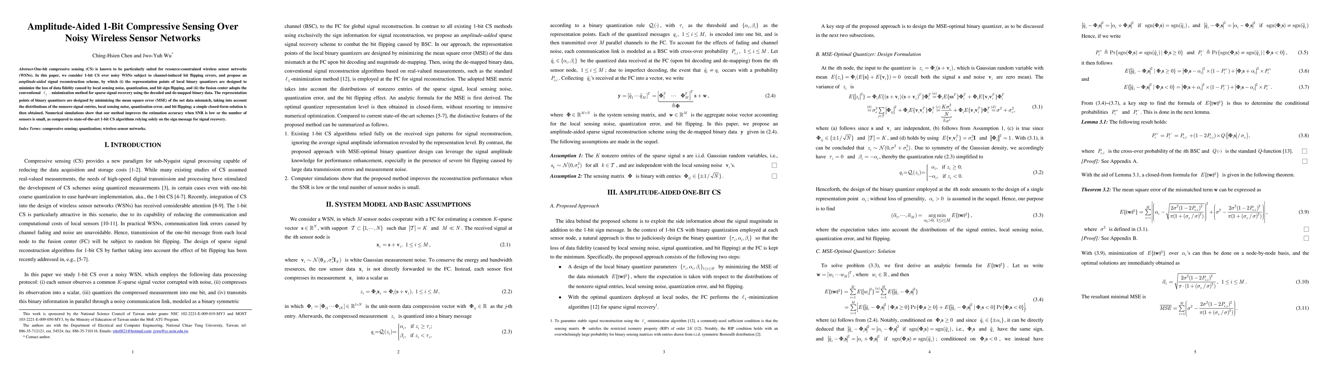 Abstract-One-bit compressive sensing (CS) is known to be particularly suited for resource-constrained wireless sensor networks (WSNs). In this paper, we consider 1-bit CS over noisy WSNs subject to channel-induced bit flipping errors, and propose an amplitude-aided signal reconstruction scheme, by which (i) the representation points of local binary quantizers are designed to minimize the loss of data fidelity caused by local sensing noise, quantization, and bit sign flipping, and (ii) the fusion center adopts the conventional minimization method for sparse signal recovery using the decoded and de-mapped binary data. The representation points of binary quantizers are designed by minimizing the mean square error (MSE) of the net data mismatch, taking into account the distributions of the nonzero signal entries, local sensing noise, quantization error, and bit flipping; a simple closed-form solution is then obtained. Numerical simulations show that our method improves the estimation accuracy when SNR is low or the number of sensors is small, as compared to state-of-the-art 1-bit CS algorithms relying solely on the sign message for signal recovery.
