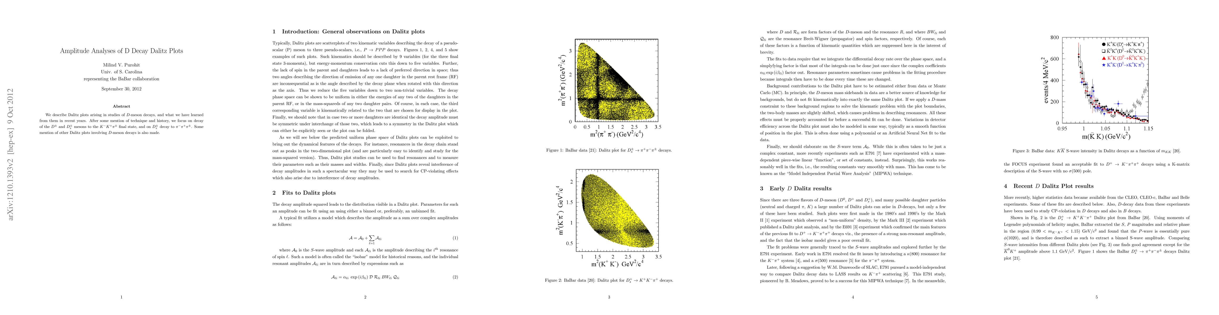 This paper analyzes Dalitz plots for $D$-meson decays, particularly focusing on $D^\pm$ and $D_s^\pm$ mesons decaying to $K^-K^+\pi^\pm$ and $D_s^\pm$ to $\pi^+\pi^-\pi^\pm$ final states, providing insights into the underlying decay mechanisms and dynamics.
