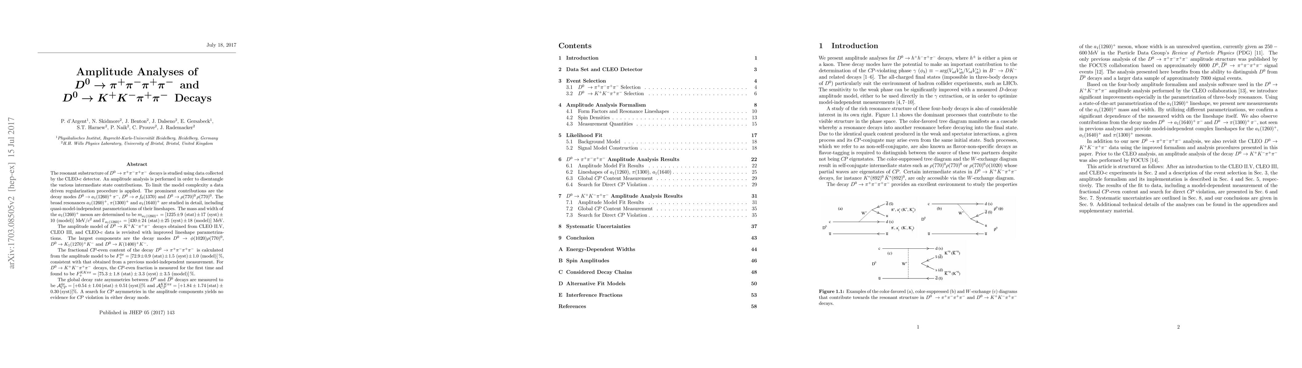 This paper conducts an amplitude analysis of $D^0$ meson decays into four-body final states using CLEO-c data, identifying prominent resonances and determining their masses and widths. It also measures the $CP$-even fractions and decay rate asymmetries for these decays.