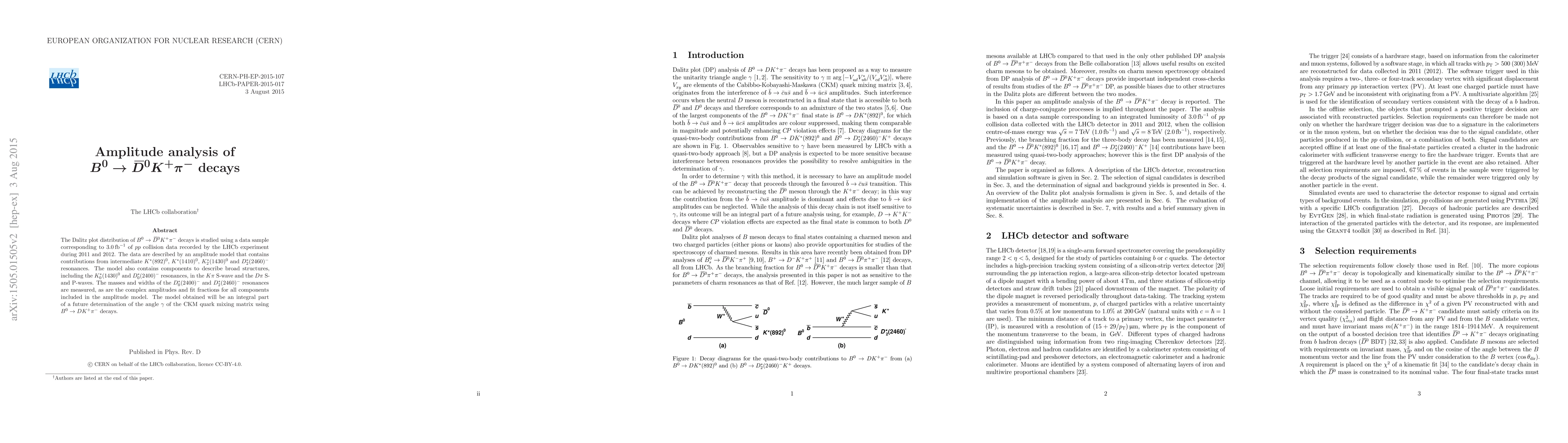 The LHCb experiment analyzes the Dalitz plot distribution of $B^0 \rightarrow \bar{D}^0 K^+ \pi^-$ decays using 3.0 fb$^{-1}$ of $pp$ collision data, identifying contributions from several resonances and measuring their masses, widths, and complex amplitudes. The findings will aid future determinations of the CKM matrix angle $\gamma$.