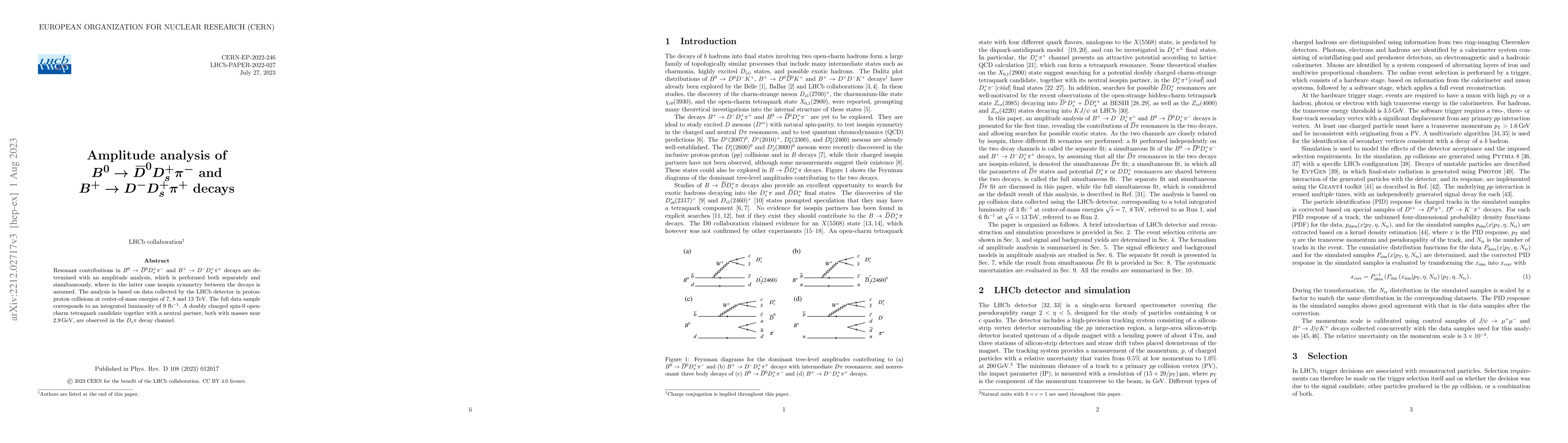The paper presents an amplitude analysis of $B^0 \rightarrow \overline{D}^0 D^+_s\pi^-$ and $B^+\rightarrow D^- D^+_s\pi^+$ decays, focusing on resonant contributions and assuming isospin symmetry. The analysis, based on LHCb data at 7, 8, and 13 TeV, identifies a spin-0 open-charm tetraquark candidate near 2.9 GeV in the $D_s\pi$ channel.