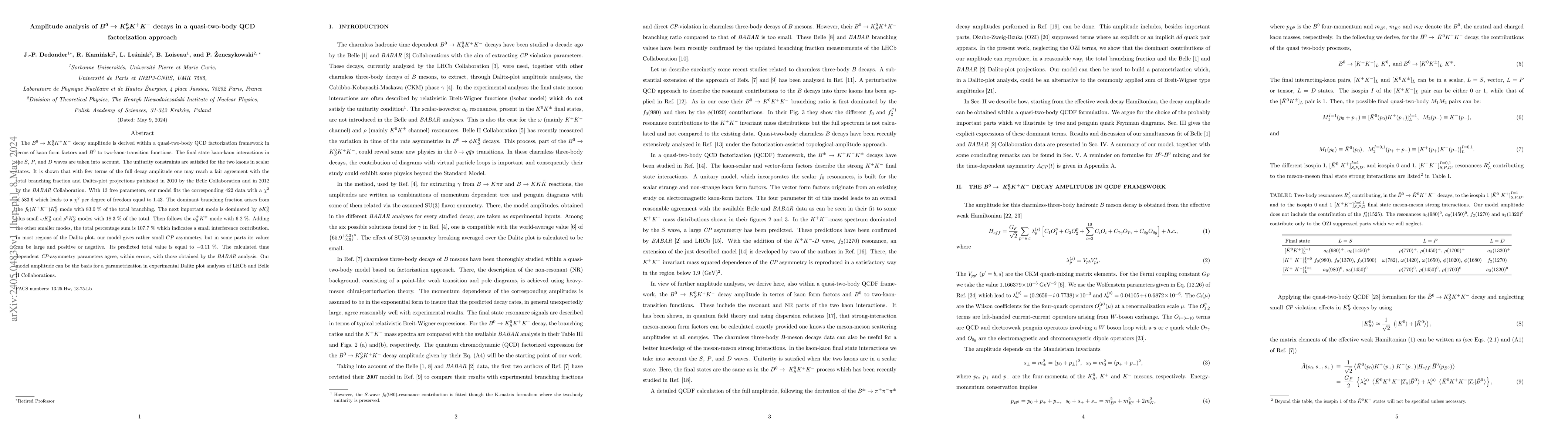 The $B^0 \to K^0_S K^+ K^- $ decay amplitude is derived within a quasi-two-body QCD factorization framework in terms of kaon form factors and $B^0$ to two-kaon-transition functions. The final state kaon-kaon interactions in the $S$, $P$, and $D$ waves are taken into account. The unitarity constraints are satisfied for the two kaons in scalar states. It is shown that with few terms of the full decay amplitude one may reach a fair agreement with the total branching fraction and Dalitz-plot projections published in 2010 by the Belle Collaboration and in 2012 by the $\textit{BABAR}$ Collaboration. With 13 free parameters, our model fits the corresponding 422 data with a $\chi^2$ of 583.6 which leads to a $\chi^2$ per degree of freedom equal to 1.43. The dominant branching fraction arises from the $f_0(K^+K^-) K^0_S$ mode with 83.0$\%$ of the total branching. The next important mode is dominated by $\phi K^0_S$ plus small $\omega K^0_S$ and $\rho^0 K^0_S$ modes with 18.3$\%$ of the total. Then follows the $a_0^\pm K^\mp$ mode with 6.2$\%$. Adding the other smaller modes, the total percentage sum is 107.7$\%$ which indicates a small interference contribution. In most regions of the Dalitz plot, our model gives rather small $CP$ asymmetry, but in some parts its values can be large and positive or negative. Its predicted total value is equal to -0.11$\%$. The calculated time dependent $\textit{CP}$-asymmetry parameters agree, within errors, with those obtained by the $\textit{BABAR}$ analysis. Our model amplitude can be the basis for a parametrization in experimental Dalitz plot analyses of LHCb and Belle II Collaborations.