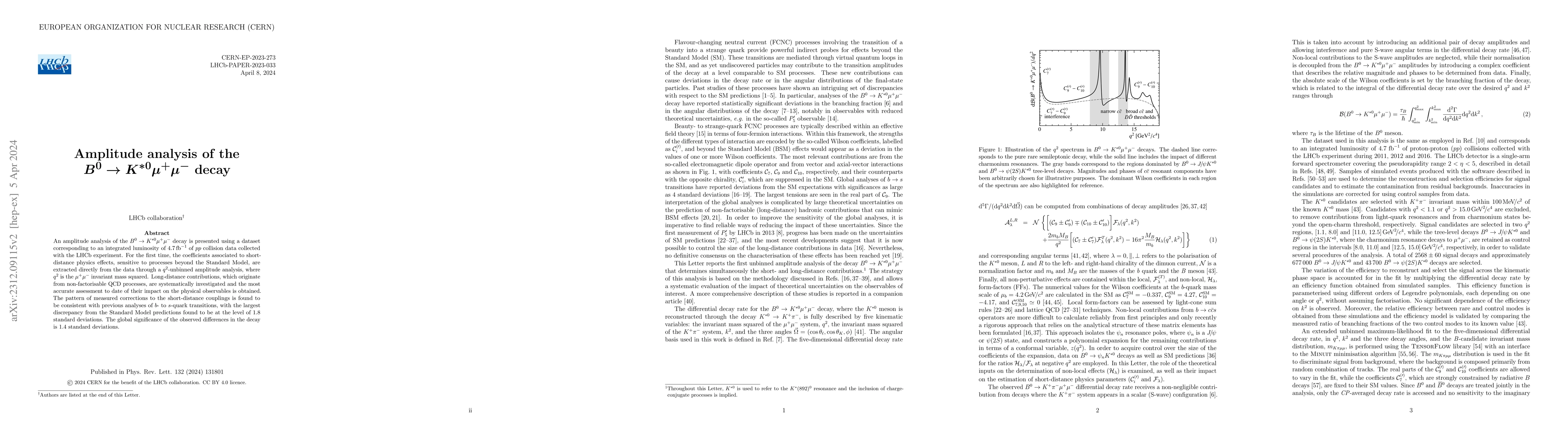 This paper presents an amplitude analysis of the $B^{0}\to K^{*0}\mu^+\mu^-$ decay using LHCb data, extracting coefficients for short-distance physics effects and assessing long-distance QCD contributions. Discrepancies from Standard Model predictions are found at 1.8 standard deviations, with a global significance of 1.4 standard deviations.