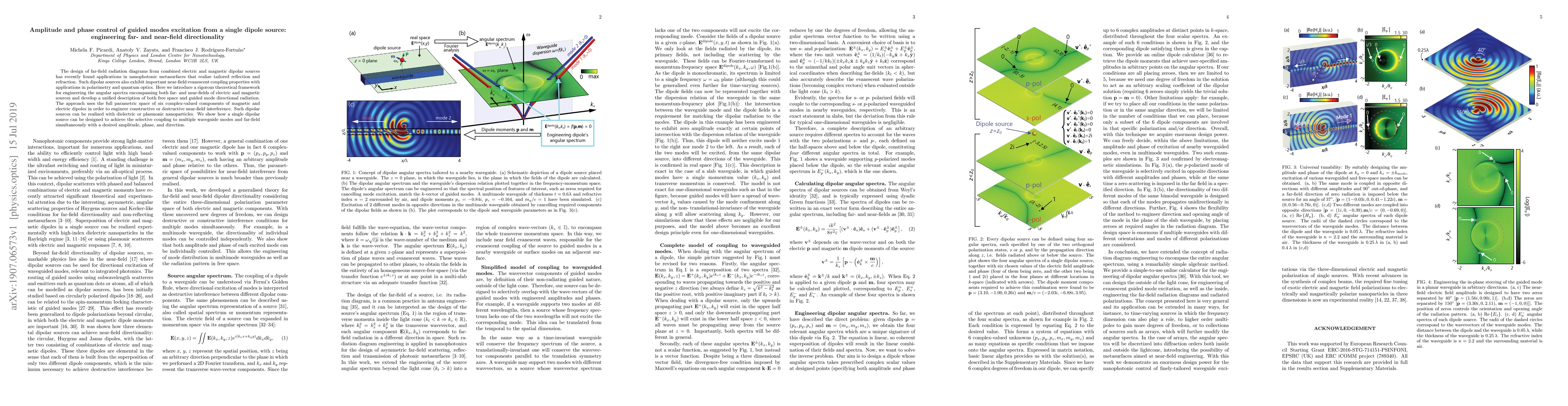 This paper presents a theoretical framework for controlling the amplitude and phase of guided mode excitation from a single dipolar source, enabling tailored far-field radiation diagrams and near-field evanescent coupling. The approach leverages the full parametric space of electric and magnetic dipoles to achieve desired directional radiation and selective coupling to waveguide modes.