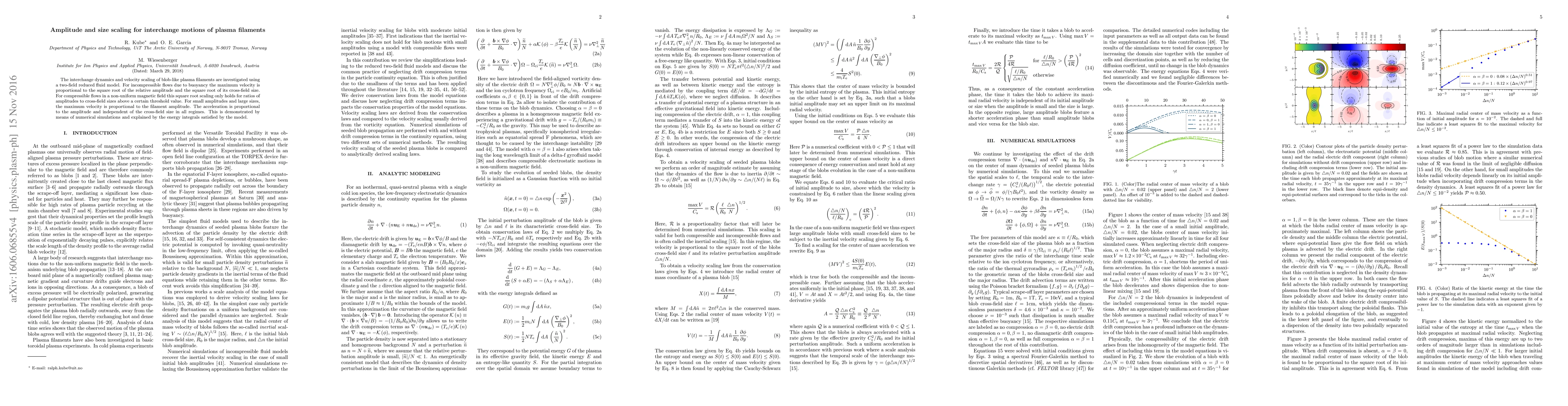 The study investigates plasma filament dynamics, finding that maximum velocity is proportional to amplitude and cross-field size for certain regimes, while acceleration is proportional to amplitude alone.