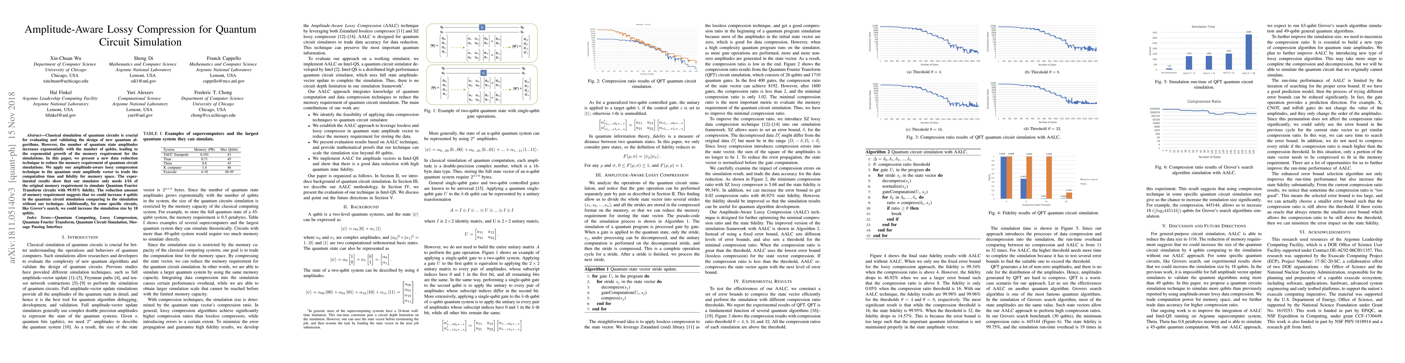This paper proposes an amplitude-aware lossy compression technique to reduce memory requirements for simulating quantum circuits, achieving 1/16th of the original memory with 99.95% fidelity. The method enables simulations of larger circuits, up to 4 more qubits generally and up to 18 more in specific cases like Grover's search.