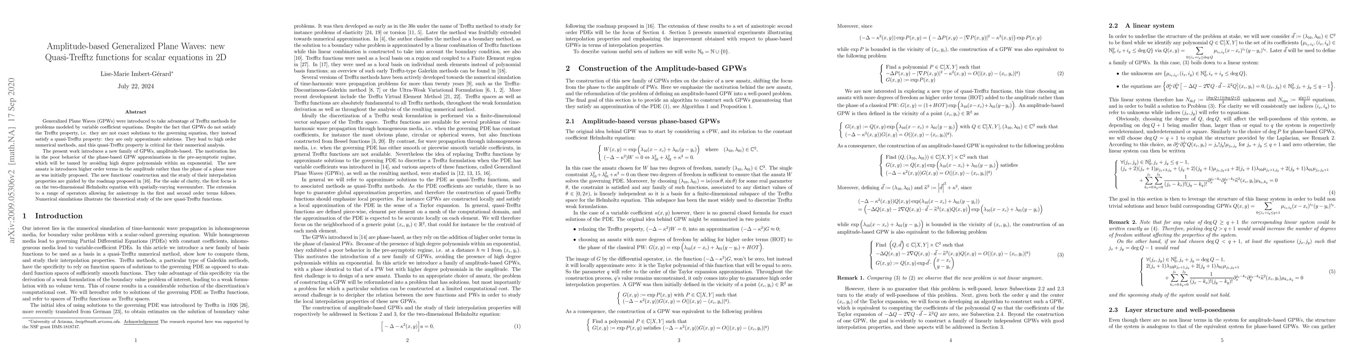New amplitude-based Generalized Plane Waves (GPWs) are introduced for solving 2D scalar equations with variable coefficients, offering a high-order numerical solution method with improved accuracy.