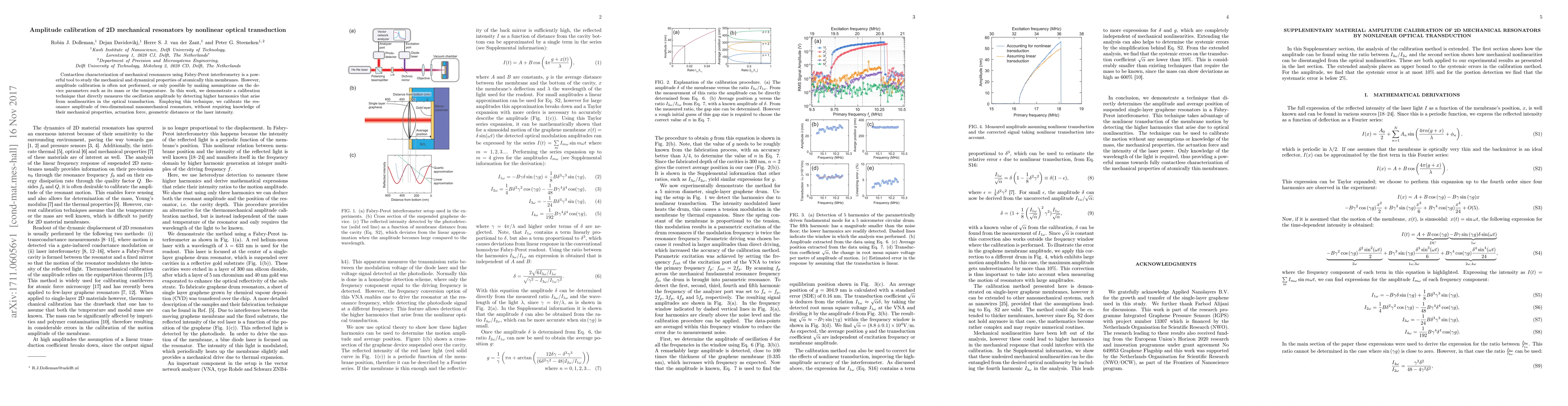 This paper presents a novel calibration method for measuring the amplitude of 2D mechanical resonators using nonlinear optical transduction, which detects higher harmonics from resonance nonlinearities. The technique allows for direct amplitude calibration without needing device-specific parameters, enhancing the contactless characterization of mechanical resonances.