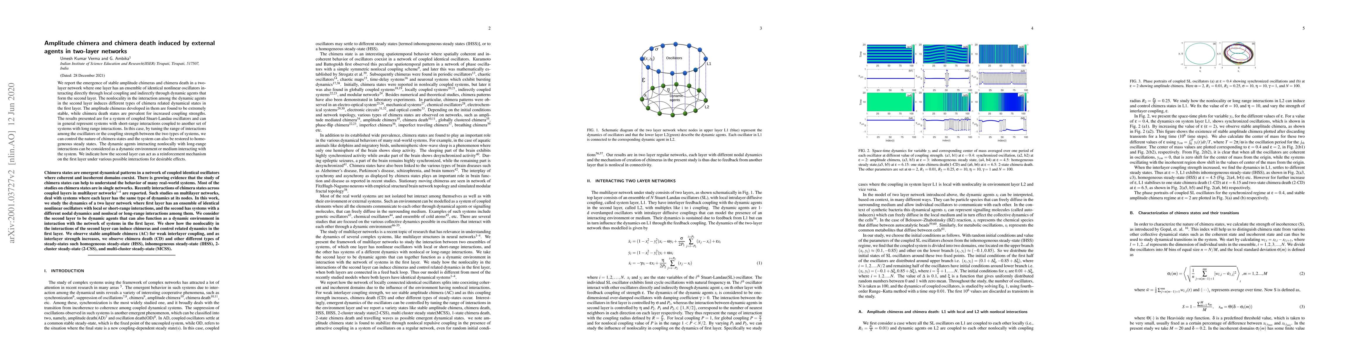 This paper investigates stable amplitude chimeras and chimera death in a two-layer network of oscillators, where one layer interacts locally and the second layer introduces nonlocal interactions via dynamic agents. The study reveals that the second layer can control the chimera states, allowing for transitions between chimera and homogeneous states through tuning interaction parameters.