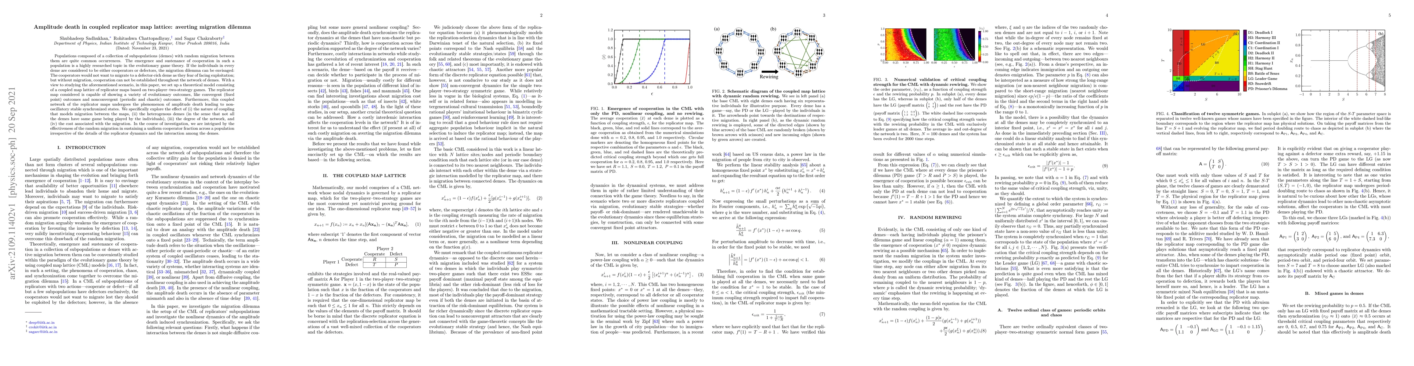 This research paper models a theoretical framework using coupled replicator map lattices to study cooperation emergence in populations with migrating subpopulations or 'demes'. The model investigates the impact of coupling nature, heterogeneous demes, network degree, and migration cost on sustaining cooperation. Key findings reveal that random migration can maintain a consistent cooperator proportion across the population, regardless of replicator dynamics and inter-deme interactions, a phenomenon known as amplitude death leading to stable synchronized states.