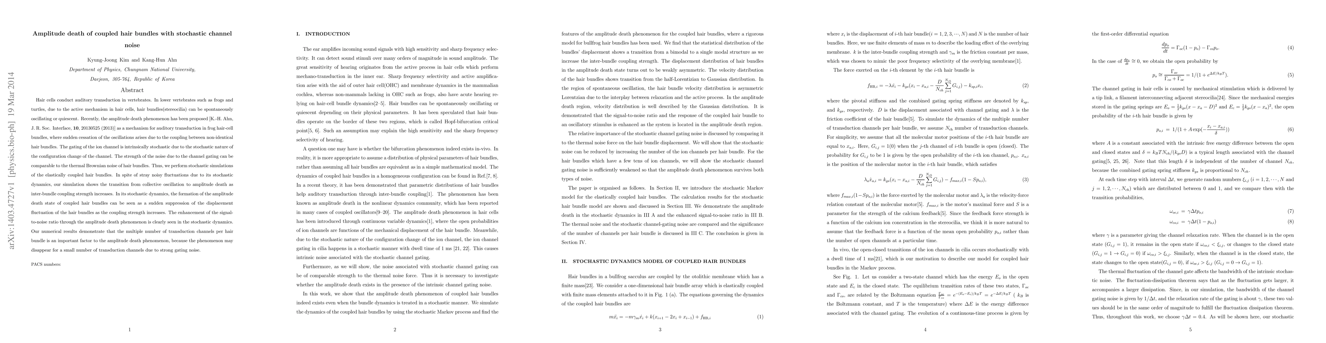 Hair cells conduct auditory transduction in vertebrates. In lower vertebrates such as frogs and turtles, due to the active mechanism in hair cells, hair bundles(stereocilia) can be spontaneously oscillating or quiescent. Recently, the amplitude death phenomenon has been proposed [K.-H. Ahn, J. R. Soc. Interface, {\bf 10}, 20130525 (2013)] as a mechanism for auditory transduction in frog hair-cell bundles, where sudden cessation of the oscillations arises due to the coupling between non-identical hair bundles. The gating of the ion channel is intrinsically stochastic due to the stochastic nature of the configuration change of the channel. The strength of the noise due to the channel gating can be comparable to the thermal Brownian noise of hair bundles. Thus, we perform stochastic simulations of the elastically coupled hair bundles. In spite of stray noisy fluctuations due to its stochastic dynamics, our simulation shows the transition from collective oscillation to amplitude death as inter-bundle coupling strength increases. In its stochastic dynamics, the formation of the amplitude death state of coupled hair bundles can be seen as a sudden suppression of the displacement fluctuation of the hair bundles as the coupling strength increases. The enhancement of the signal-to-noise ratio through the amplitude death phenomenon is clearly seen in the stochastic dynamics. Our numerical results demonstrate that the multiple number of transduction channels per hair bundle is an important factor to the amplitude death phenomenon, because the phenomenon may disappear for a small number of transduction channels due to strong gating noise.