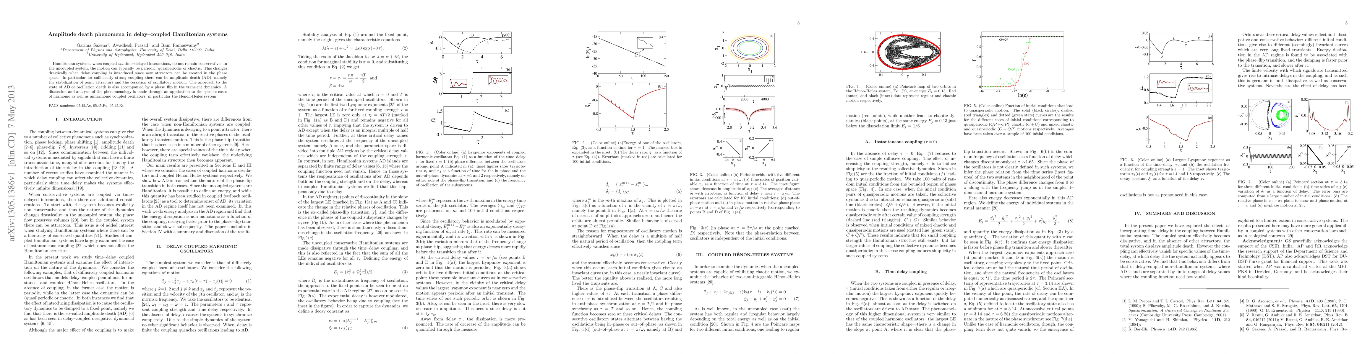Hamiltonian systems, when coupled {\it via} time--delayed interactions, do not remain conservative. In the uncoupled system, the motion can typically be periodic, quasiperiodic or chaotic. This changes drastically when delay coupling is introduced since now attractors can be created in the phase space. In particular for sufficiently strong coupling there can be amplitude death (AD), namely the stabilization of point attractors and the cessation of oscillatory motion. The approach to the state of AD or oscillation death is also accompanied by a phase--flip in the transient dynamics. A discussion and analysis of the phenomenology is made through an application to the specific cases of harmonic as well as anharmoniccoupled oscillators, in particular the H\'enon-Heiles system.