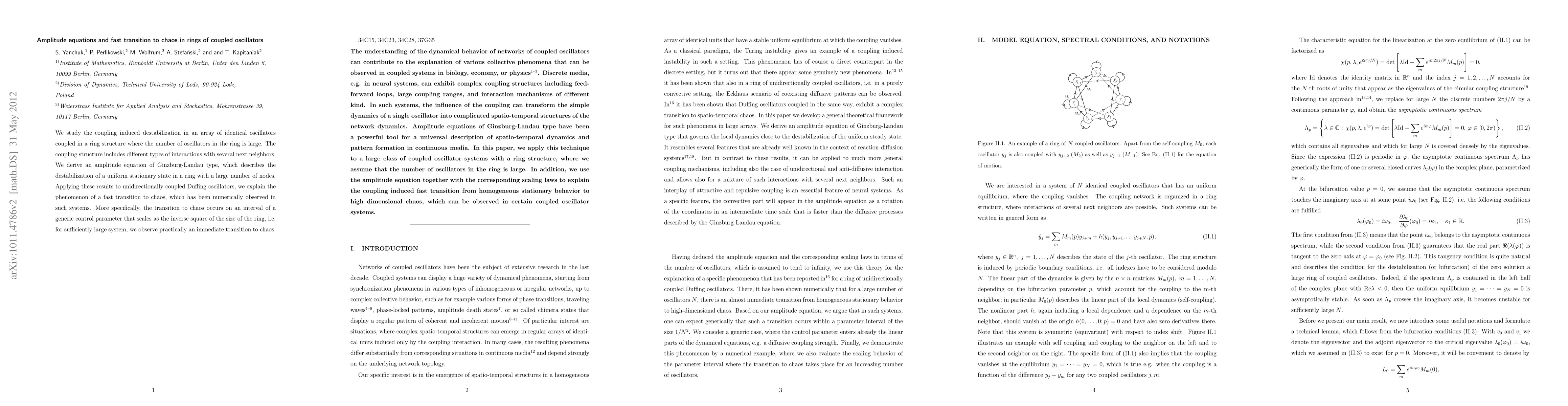 We study the coupling induced destabilization in an array of identical oscillators coupled in a ring structure where the number of oscillators in the ring is large. The coupling structure includes different types of interactions with several next neighbors. We derive an amplitude equation of Ginzburg-Landau type, which describes the destabilization of a uniform stationary state in a ring with a large number of nodes. Applying these results to unidirectionally coupled Duffing oscillators, we explain the phenomenon of a fast transition to chaos, which has been numerically observed in such systems. More specifically, the transition to chaos occurs on an interval of a generic control parameter that scales as the inverse square of the size of the ring, i.e. for sufficiently large system, we observe practically an immediate transition to chaos.