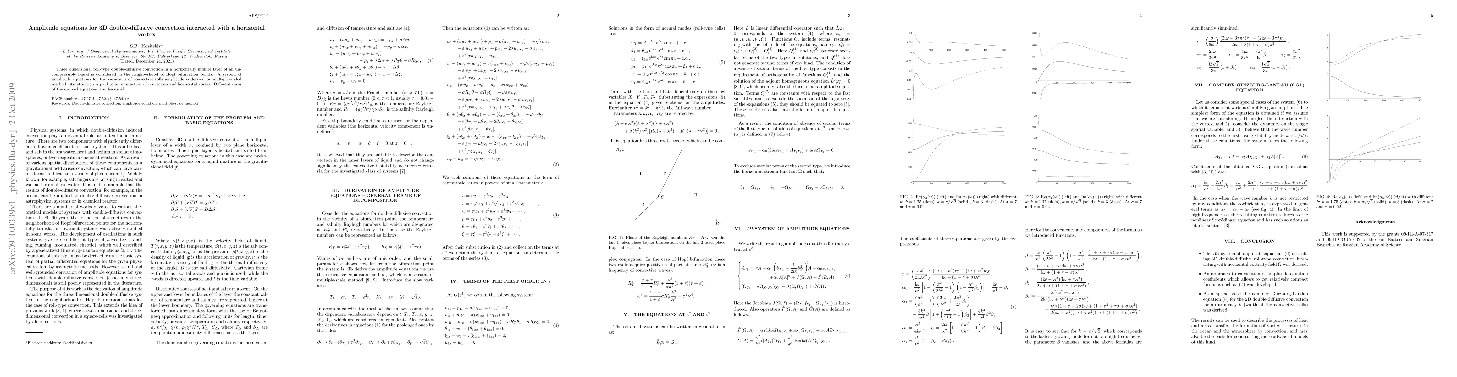 Three dimensional roll-type double-diffusive convection in a horizontally infinite layer of an uncompressible liquid is considered in the neighborhood of Hopf bifurcation points. A system of amplitude equations for the variations of convective rolls amplitude is derived by multiple-scaled method. An attention is paid to an interaction of convection and horizontal vortex. Different cases of the derived equations are discussed.