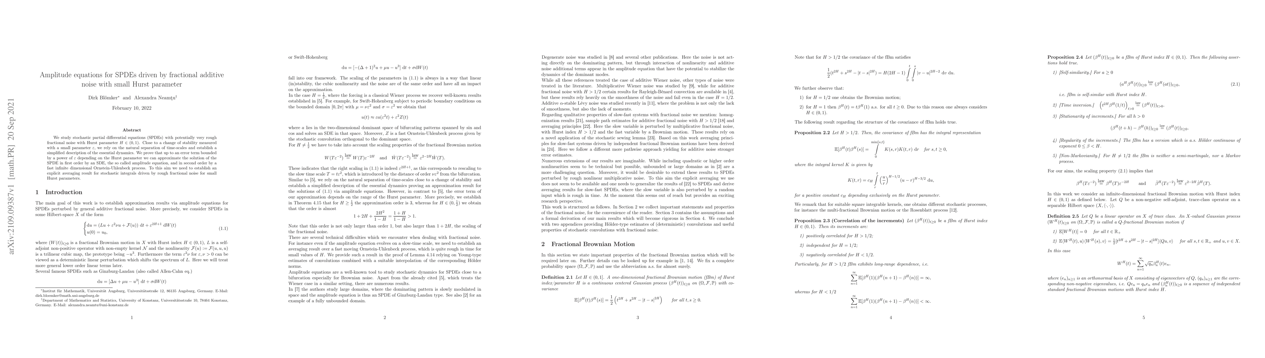 This paper investigates SPDEs driven by fractional additive noise with a small Hurst parameter, focusing on dynamics near a stability change. It establishes an amplitude equation approximation for the SPDE solution, showing first-order accuracy by an SDE and second-order accuracy by a fast infinite-dimensional Ornstein-Uhlenbeck process.