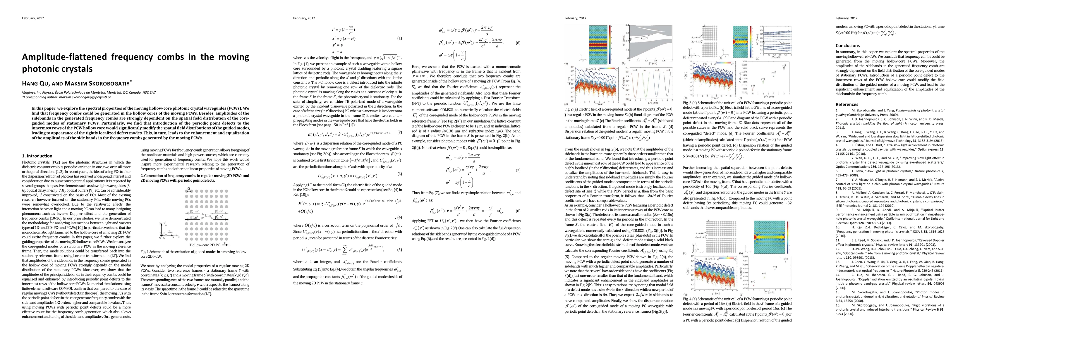 This paper investigates the spectral properties of moving hollow-core photonic crystal waveguides, revealing that frequency combs can be generated in their hollow cores. Introducing periodic point defects modifies the spatial field distribution, leading to the enhancement and equalization of the sideband amplitudes in the generated frequency combs.
