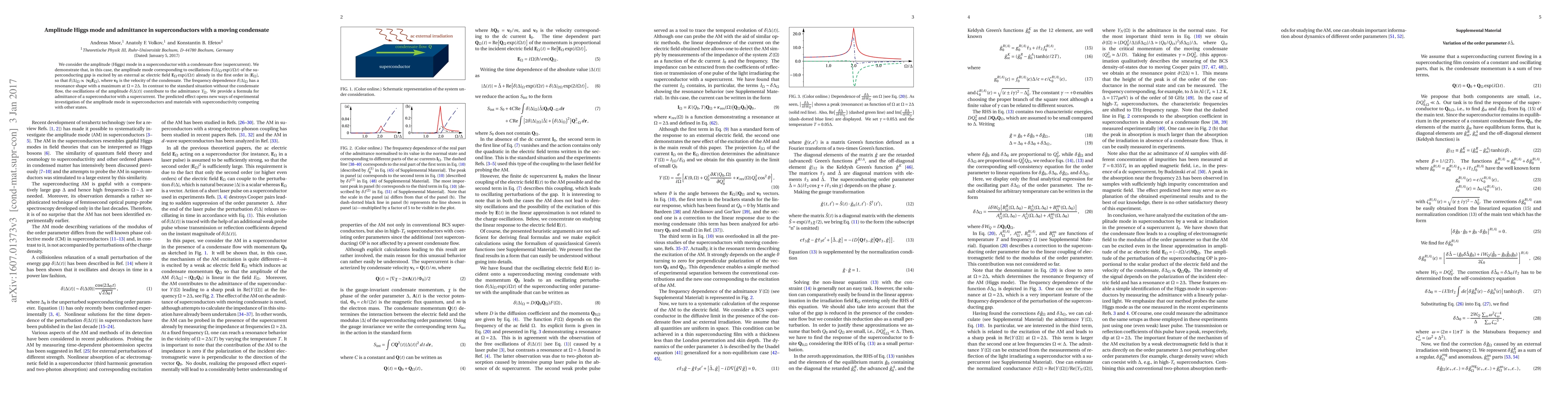 The research paper discusses the excitation of the amplitude (Higgs) mode in superconductors with a flowing condensate (supercurrent) by an external ac electric field. The amplitude mode, characterized by oscillations of the superconducting gap, is excited in the first order of the electric field strength. The frequency dependence of this mode shows a resonance peak at twice the superconducting gap value. Uniquely, these amplitude oscillations now influence the admittance of the superconductor, providing a new method for studying the amplitude mode and materials with superconductivity competing with other states.