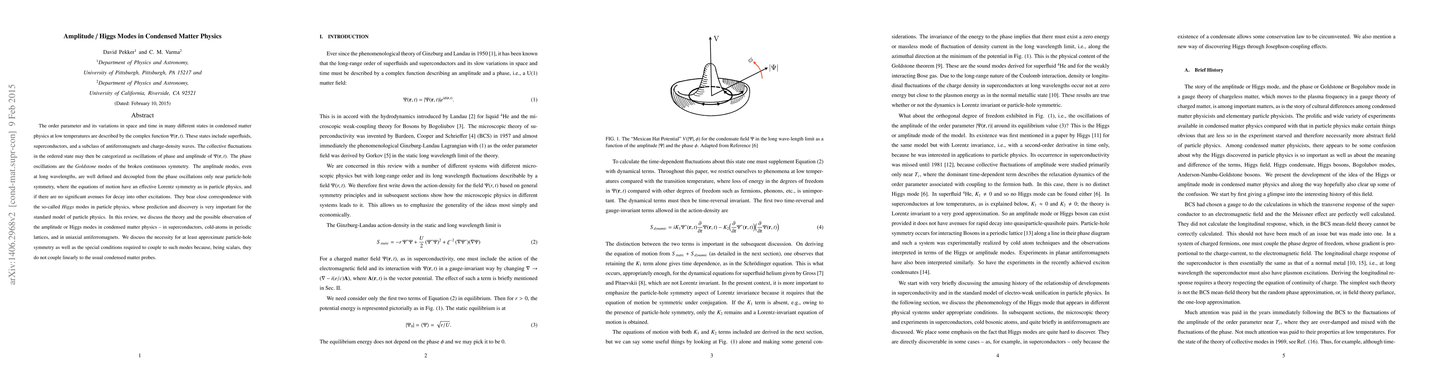 This paper reviews the theory and potential observation of amplitude or Higgs modes in various condensed matter systems, emphasizing their importance analogous to Higgs modes in particle physics. It highlights the conditions needed for these modes to be distinct and observable, especially near particle-hole symmetry and in systems like superconductors and uniaxial antiferromagnets.