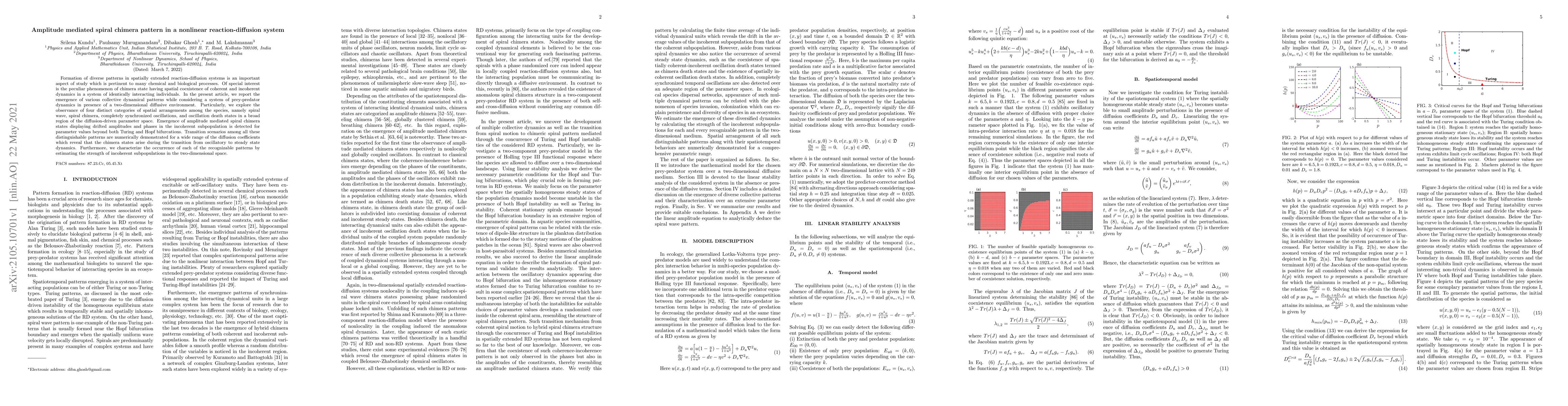 This paper investigates the formation of diverse dynamical patterns in a nonlinear reaction-diffusion system, focusing on the emergence of spiral chimera states, where coherent and incoherent dynamics coexist. It demonstrates the transition among various patterns, including spiral waves, chimera states, synchronization, and oscillation death, revealing that chimera states appear during transitions from oscillatory to steady-state dynamics.