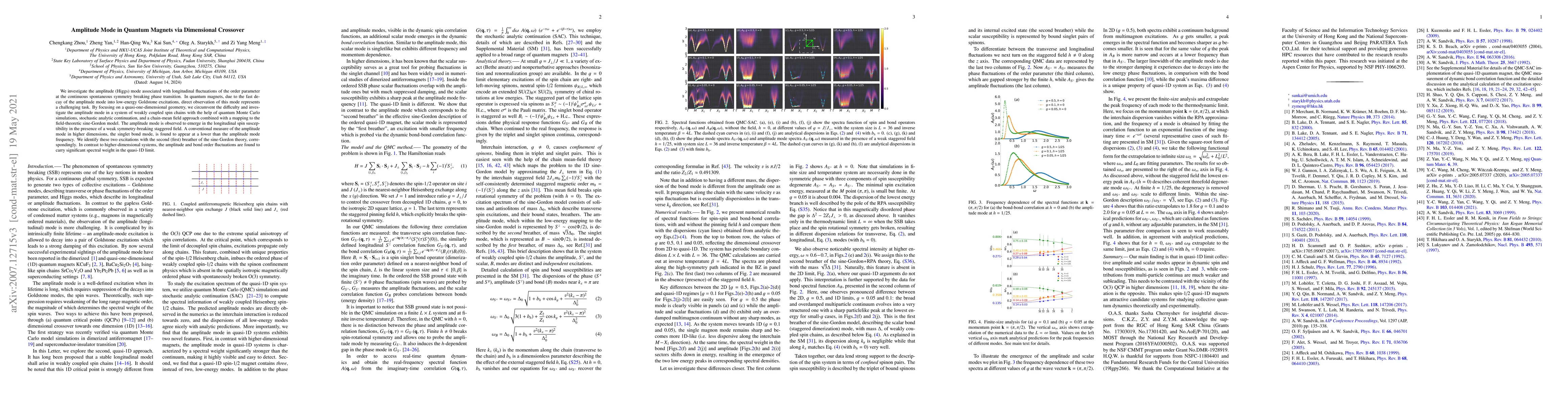 This paper investigates the amplitude mode in quantum magnets using quantum Monte Carlo simulations and theoretical models, finding that in quasi-one-dimensional systems, this mode emerges in longitudinal spin susceptibility under a weak staggered field, contrasting with higher-dimensional systems where it is overshadowed by the singlet bond mode.