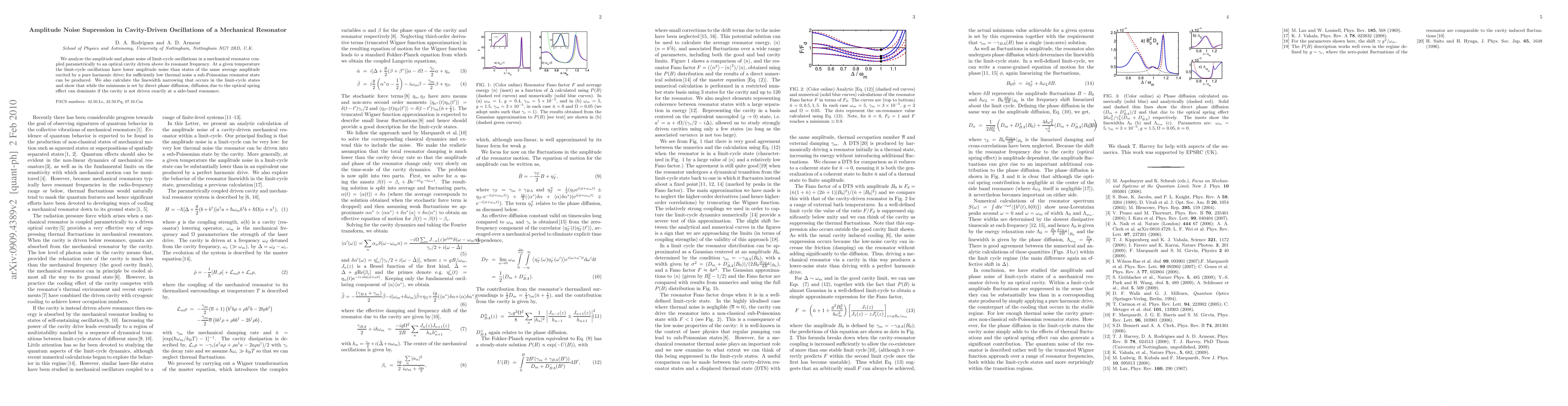 This paper investigates amplitude and phase noise in limit-cycle oscillations of a mechanically driven resonator coupled to an optical cavity, finding that these oscillations exhibit lower amplitude noise compared to harmonically driven states. It also demonstrates linewidth narrowing in these states, with phase diffusion dominating noise reduction unless the cavity is precisely driven at a side-band resonance.