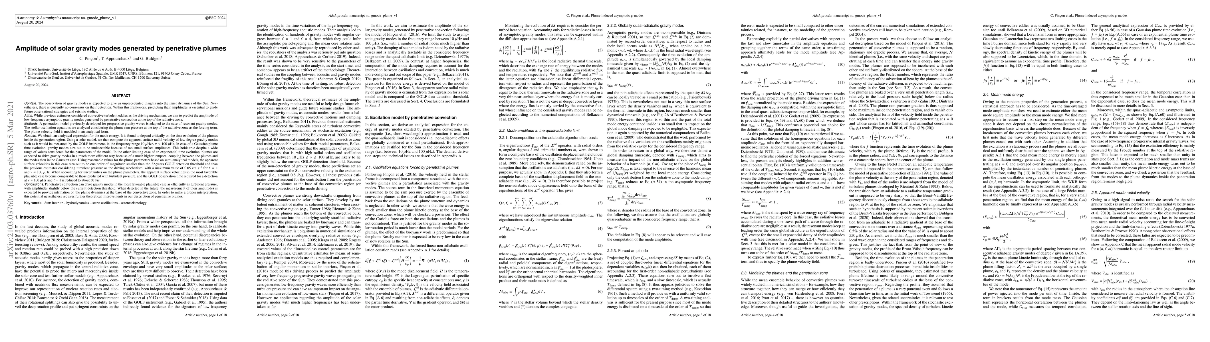 Researchers predict the amplitude of solar gravity modes generated by penetrative plumes in the Sun, finding that only an exponential time evolution leads to detectable surface amplitudes, with a maximum value of 0.05 cm s^{-1} for specific parameters.
