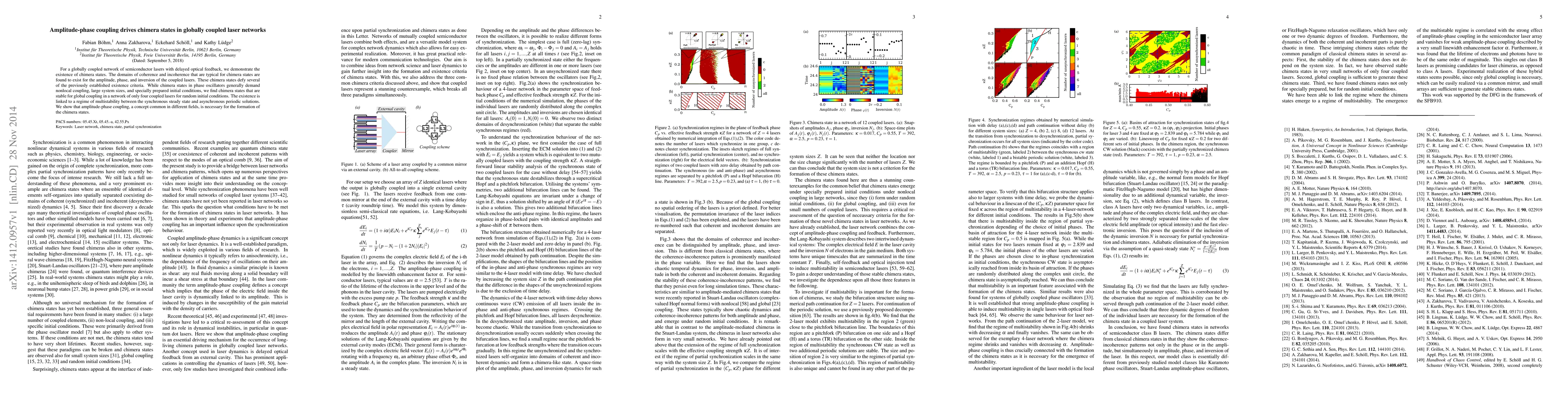 For a globally coupled network of semiconductor lasers with delayed optical feedback, we demonstrate the existence of chimera states. The domains of coherence and incoherence that are typical for chimera states are found to exist for the amplitude, phase, and inversion of the coupled lasers. These chimera states defy several of the previously established existence criteria. While chimera states in phase oscillators generally demand nonlocal coupling, large system sizes, and specially prepared initial conditions, we find chimera states that are stable for global coupling in a network of only four coupled lasers for random initial conditions. The existence is linked to a regime of multistability between the synchronous steady state and asynchronous periodic solutions. We show that amplitude-phase coupling, a concept common in different fields, is necessary for the formation of the chimera states.