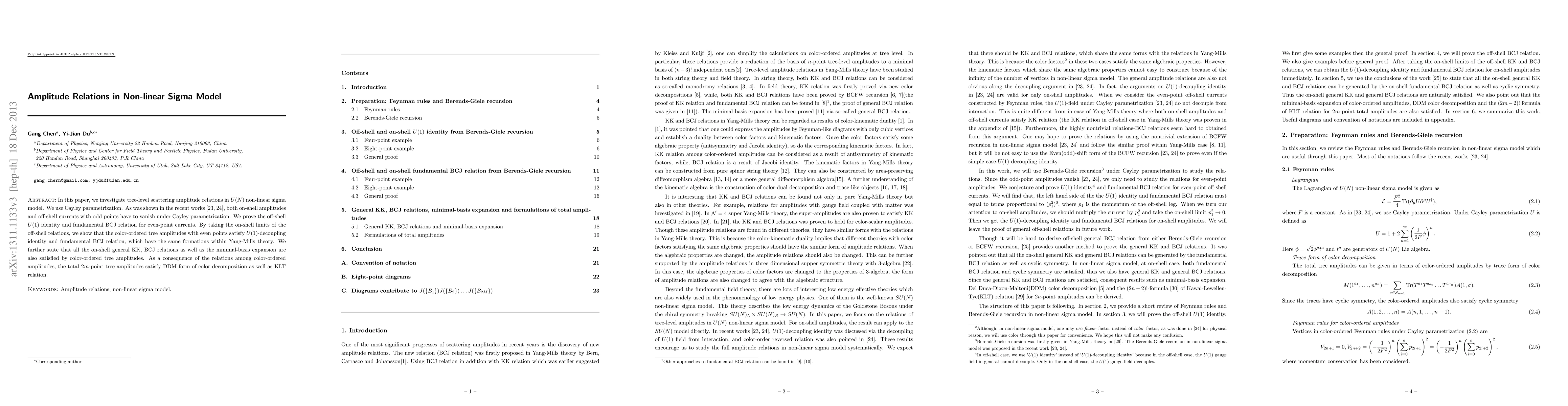 This paper explores tree-level scattering amplitude relations in $U(N)$ non-linear sigma models using Cayley parametrization, proving $U(1)$ identities and BCJ relations for even-point currents and showing that $U(1)$-decoupling and BCJ identities hold for color-ordered tree amplitudes, ultimately satisfying DDM form and KLT relation for $2m$-point amplitudes.