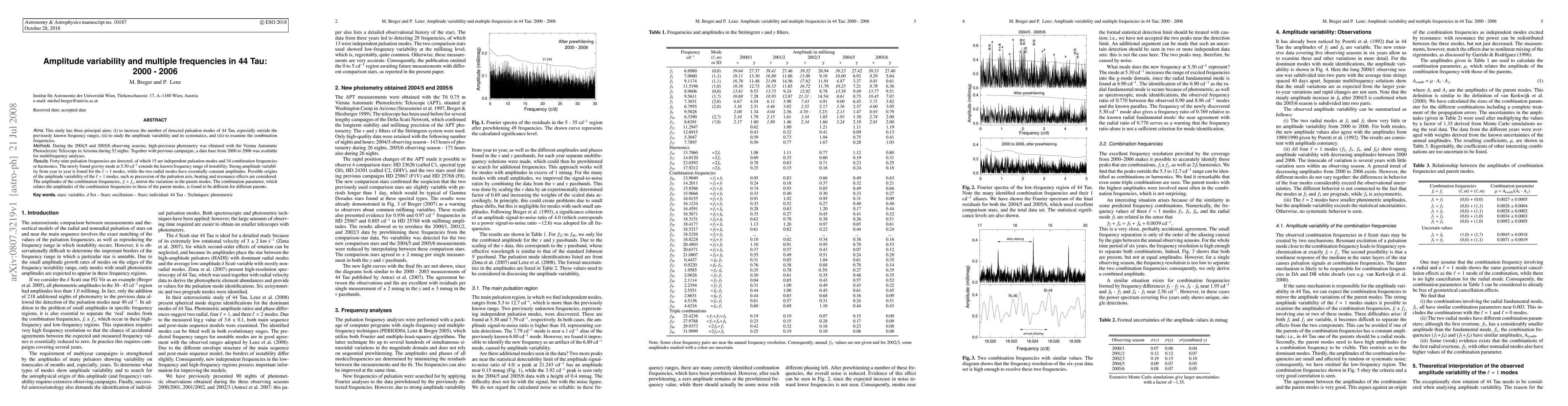 This study has three principal aims: (i) to increase the number of detected pulsation modes of 44 Tau, especially outside the previously known frequency ranges, (ii) to study the amplitude variability and its systematics, and (iii) to examine the combination frequencies. During the 2004/5 and 2005/6 observing seasons, high-precision photometry was obtained with the Vienna Automatic Photoelectric Telescope in Arizona during 52 nights. Together with previous campaigns, a data base from 2000 to 2006 was available for multifrequency analyses. Forty-nine pulsation frequencies are detected, of which 15 are independent pulsation modes and 34 combination frequencies or harmonics. The newly found gravity mode at 5.30 c/d extends the known frequency range of instability. Strong amplitude variability from year to year is found for the \ell = 1 modes, while the two radial modes have essentially constant amplitudes. Possible origins of the amplitude variability of the \ell = 1 modes, such as precession of the pulsation axis, beating and resonance effects are considered. The amplitudes of the combination frequencies, f_i + f_j, mirror the variations in the parent modes. The combination parameter, which relates the amplitudes of the combination frequencies to those of the parent modes, is found to be different for different parents.